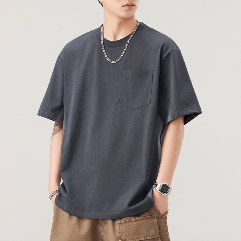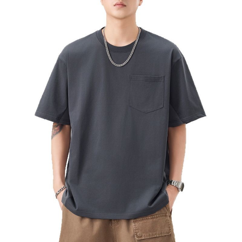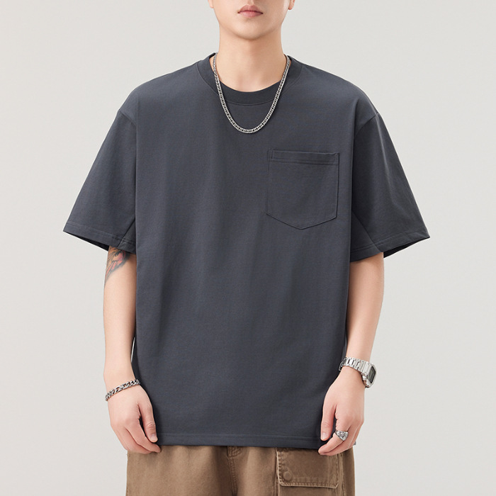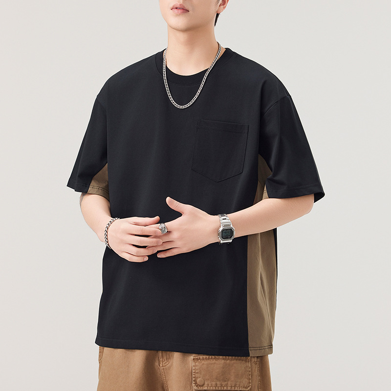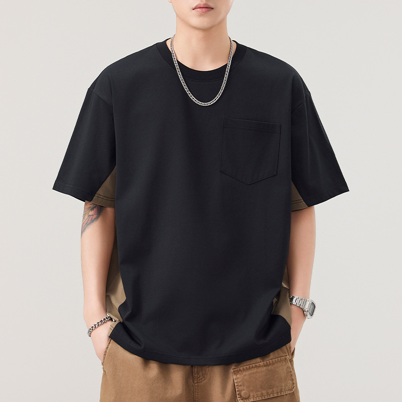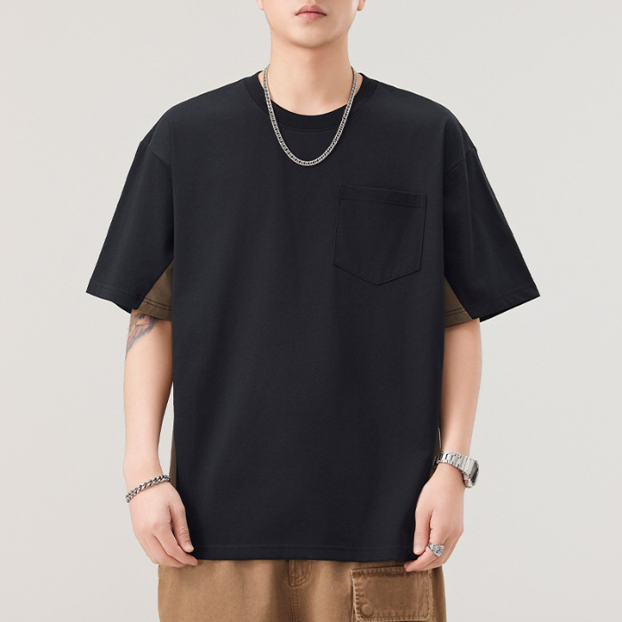 夏季新款短袖T恤男生拼接口袋圆领宽松五分袖体恤日系复古打底衫