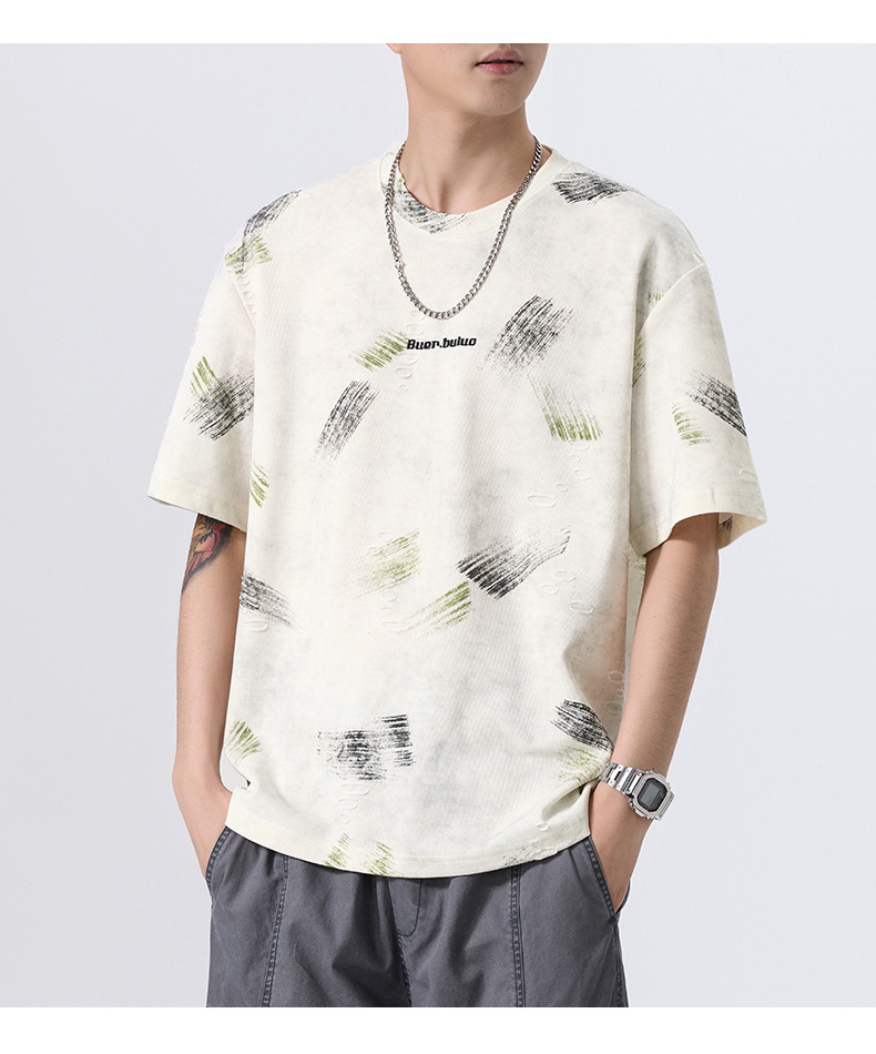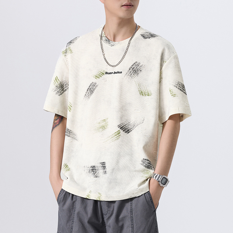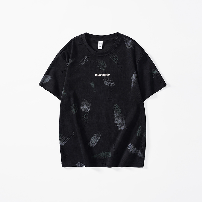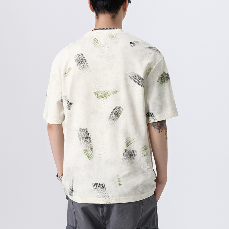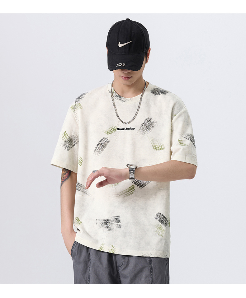 云染漏洞高端美式240g重磅短袖t恤男宽松夏季假破洞印花圆领体恤