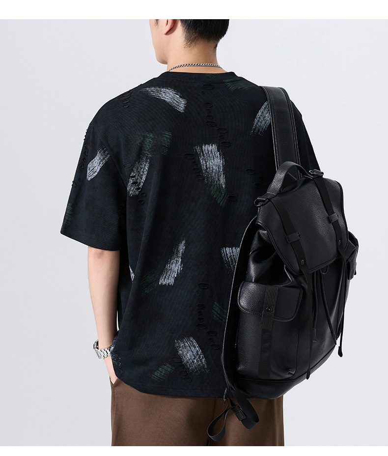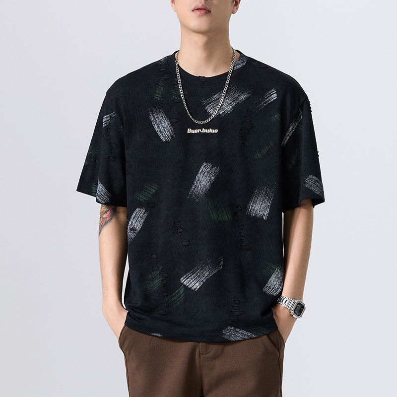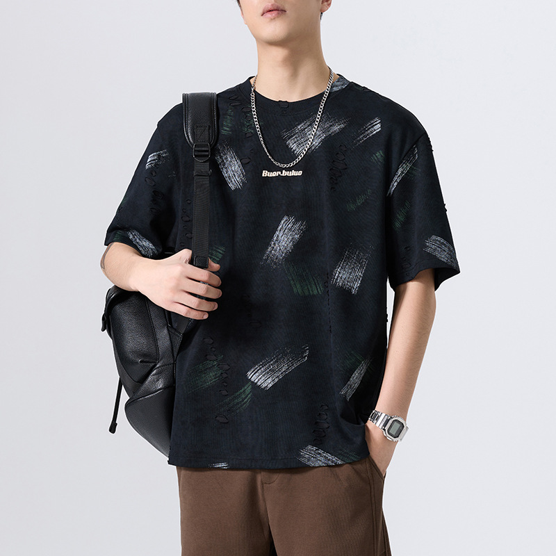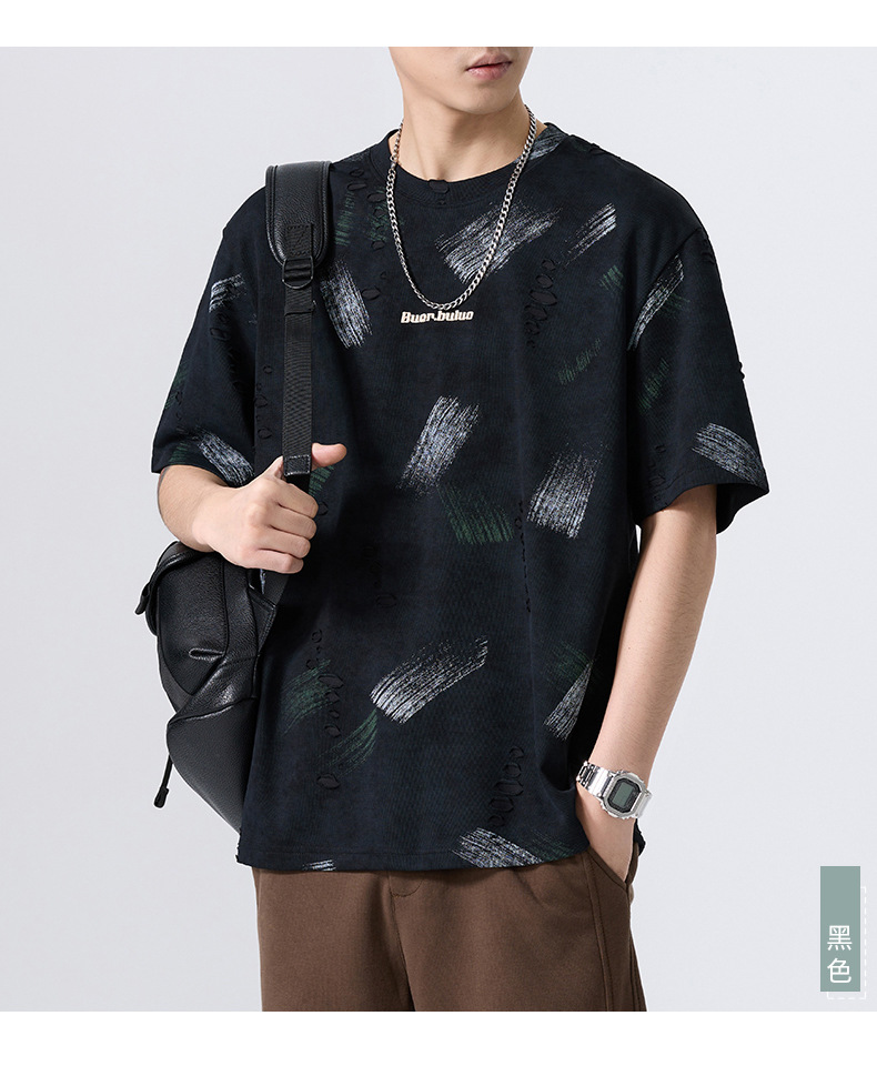 云染漏洞高端美式240g重磅短袖t恤男宽松夏季假破洞印花圆领体恤
