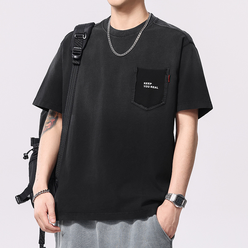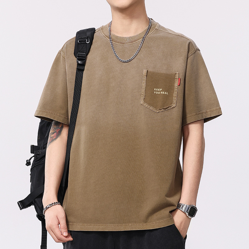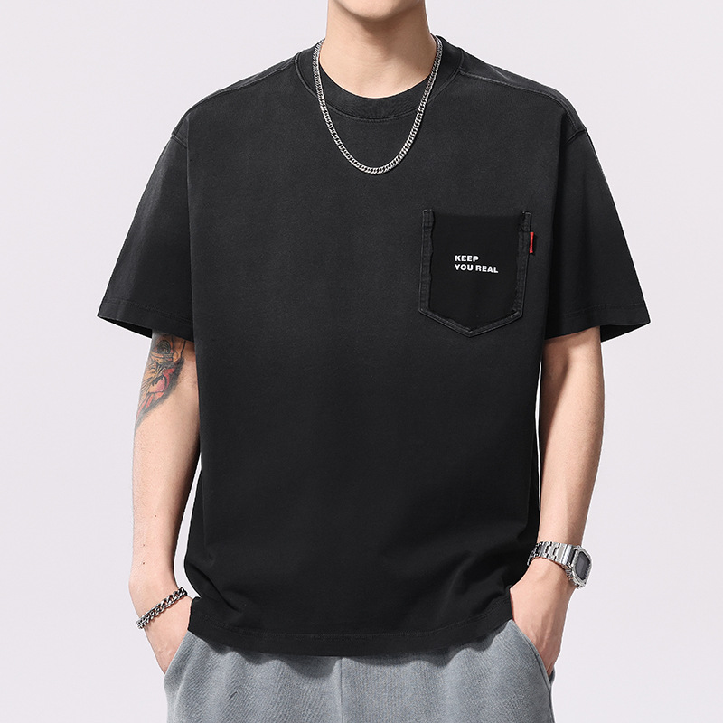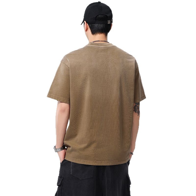 夏季新款美式渐变水洗短袖T恤男260g重磅纯棉圆领印花五分袖上衣