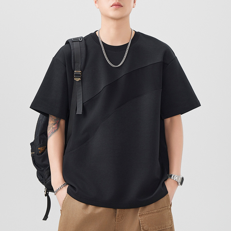 280g夏季新款拼接设计感短袖T恤男士日系宽松潮流五分袖圆领上衣