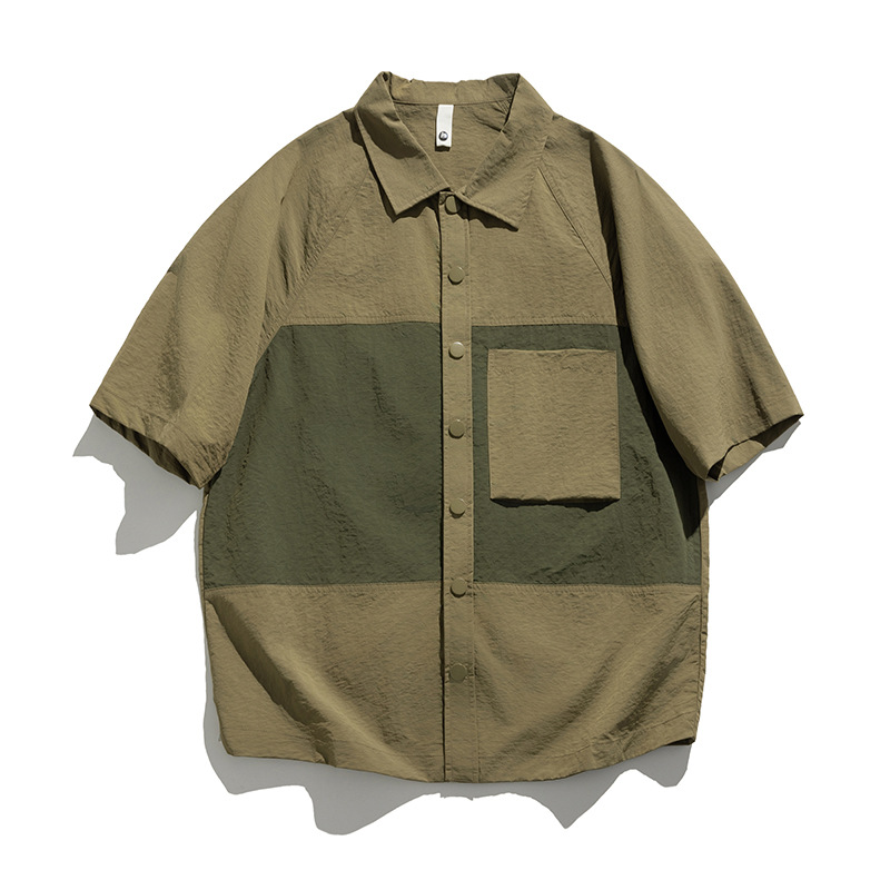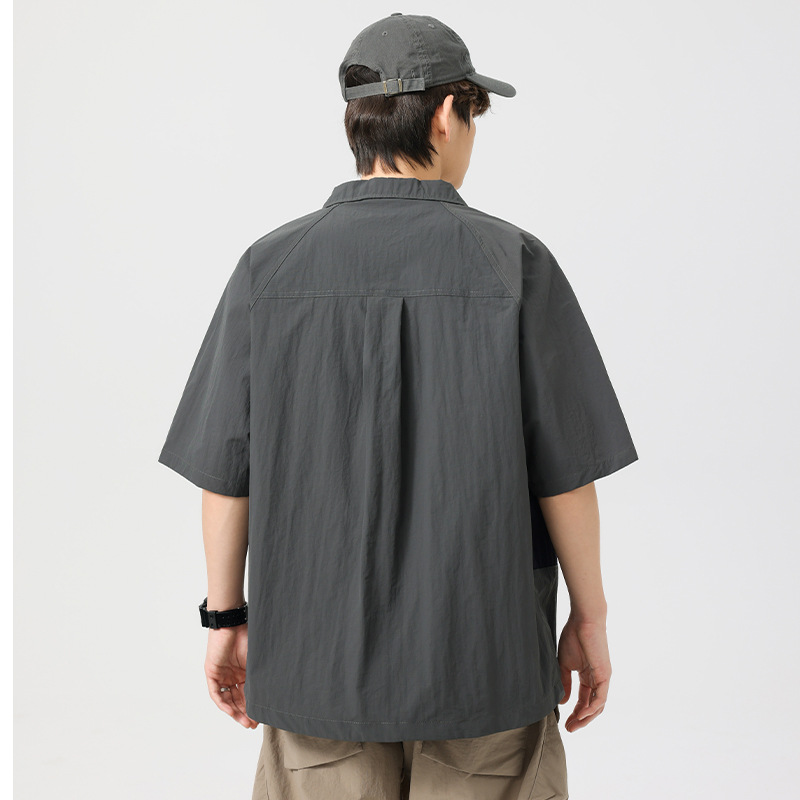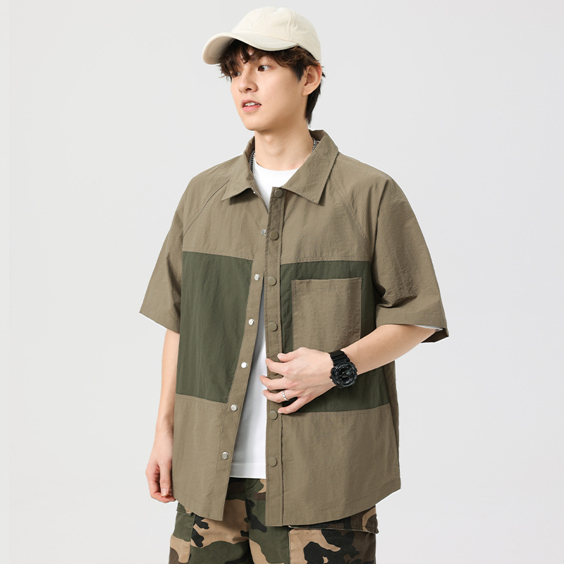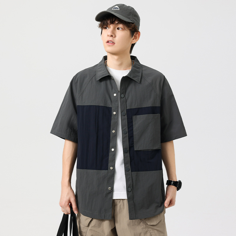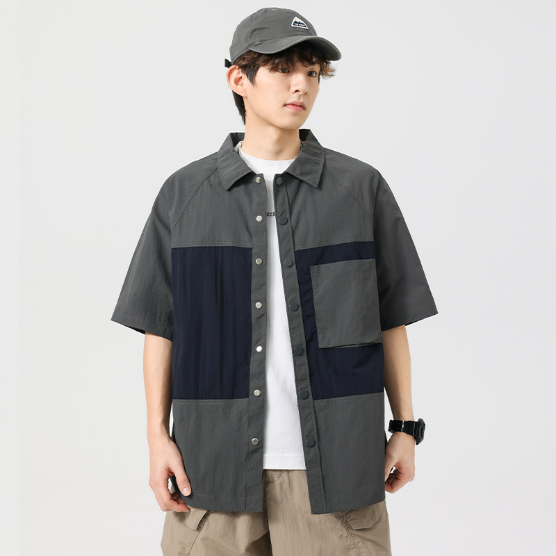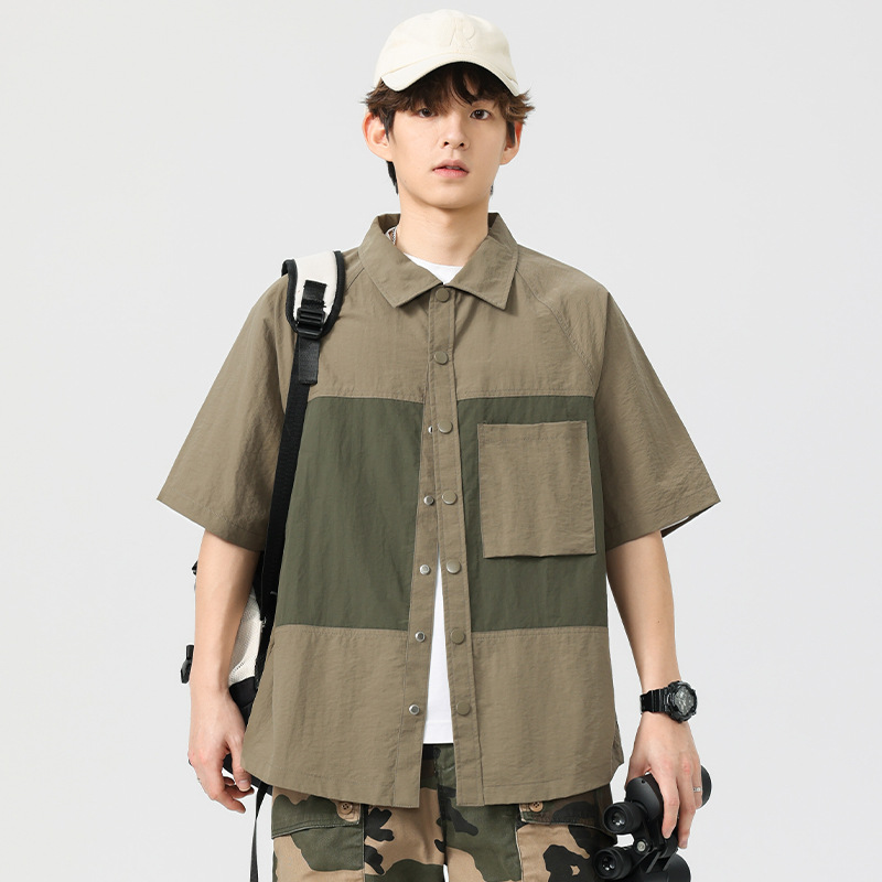 高端山系拼接撞色工装短袖衬衫男士夏季宽松日系复古潮牌衬衣