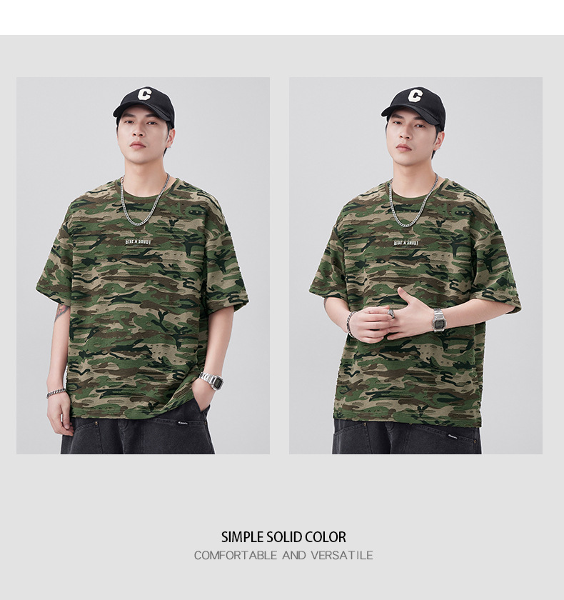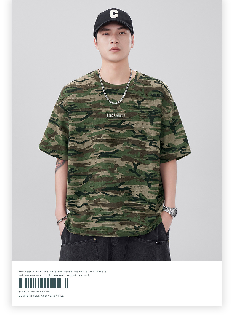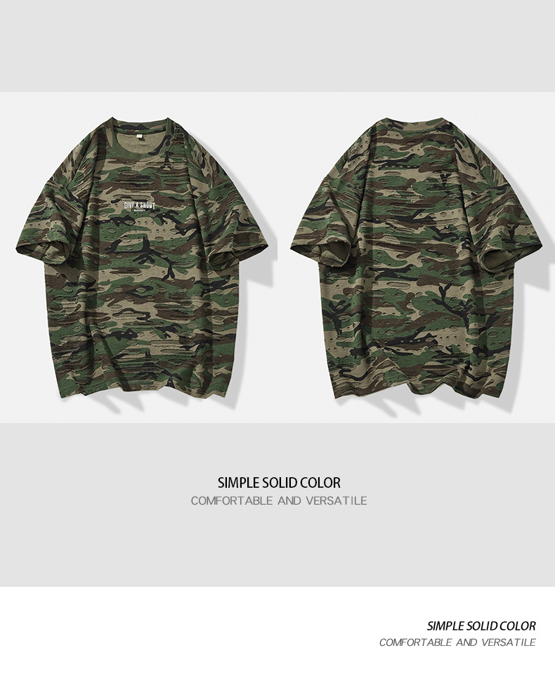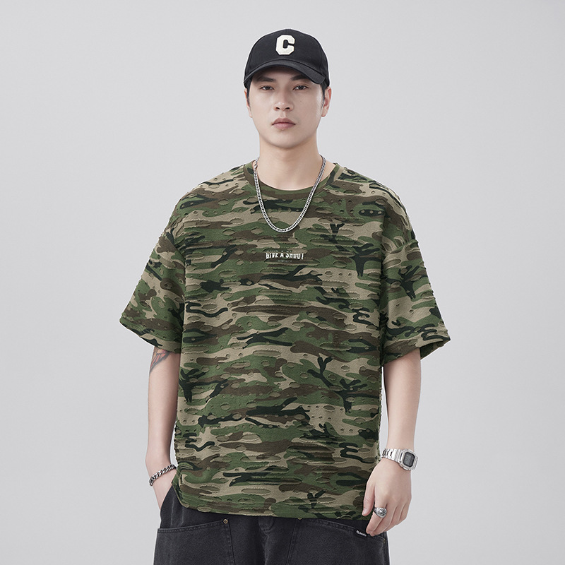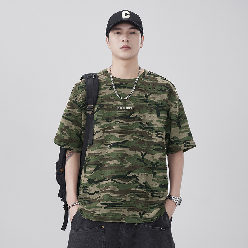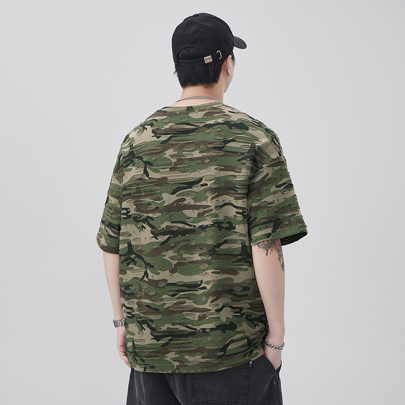潮牌重磅迷彩破洞短袖T恤男夏季美式潮流印花宽松大码薄款休闲T恤