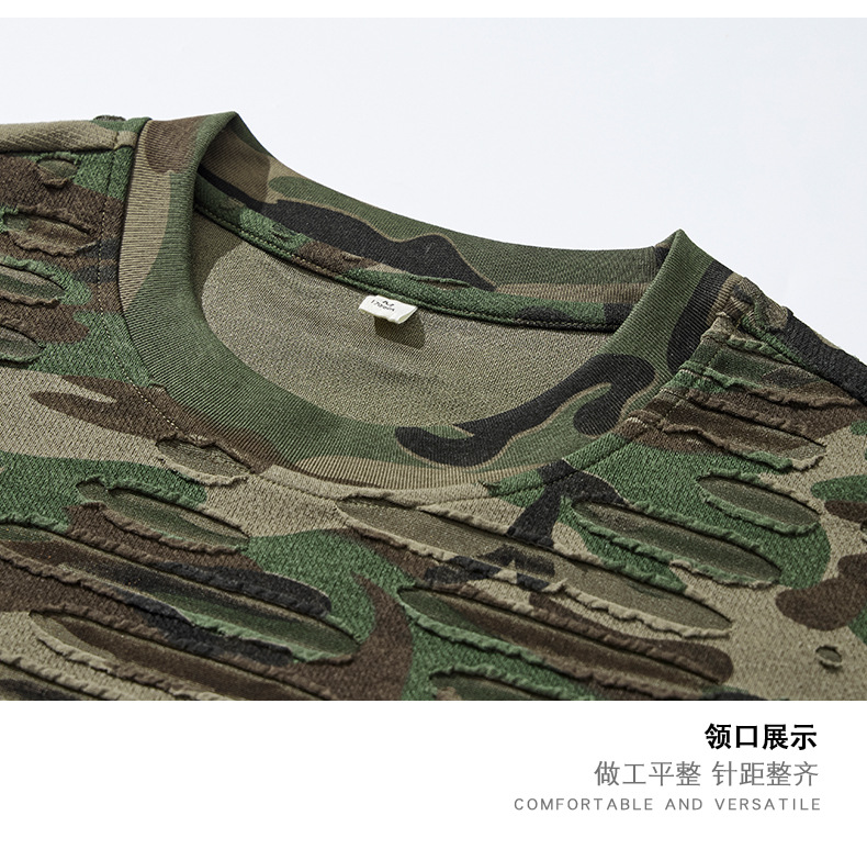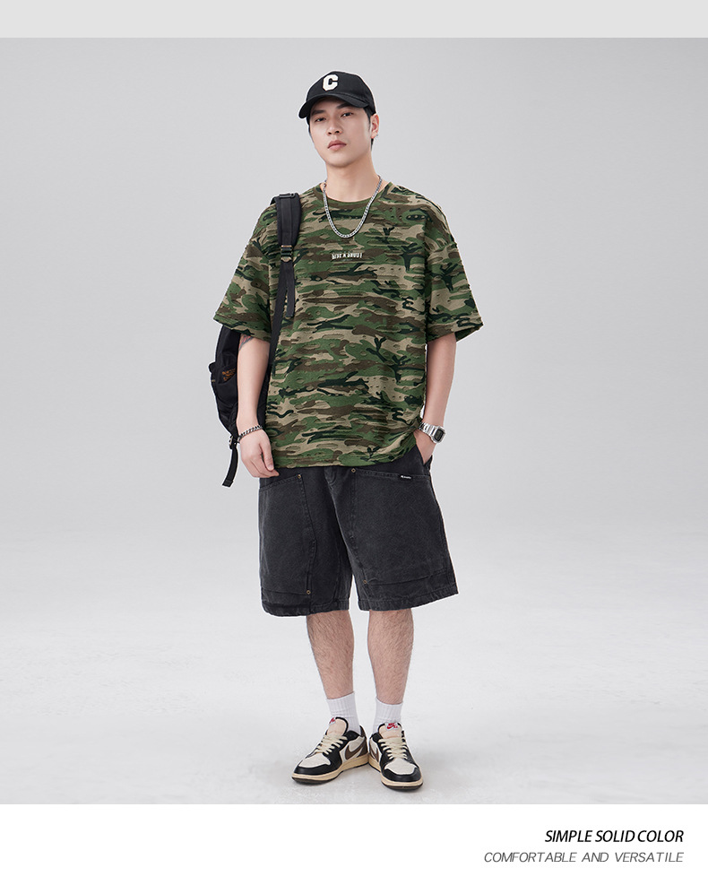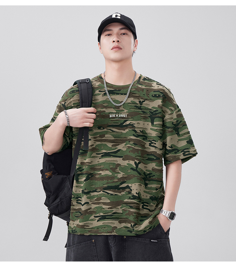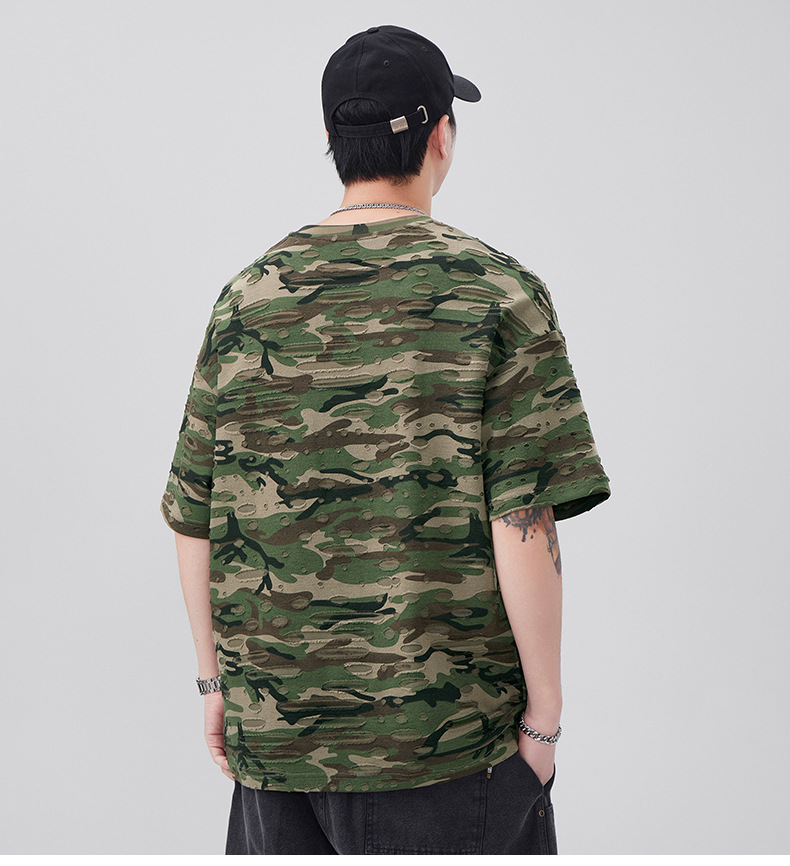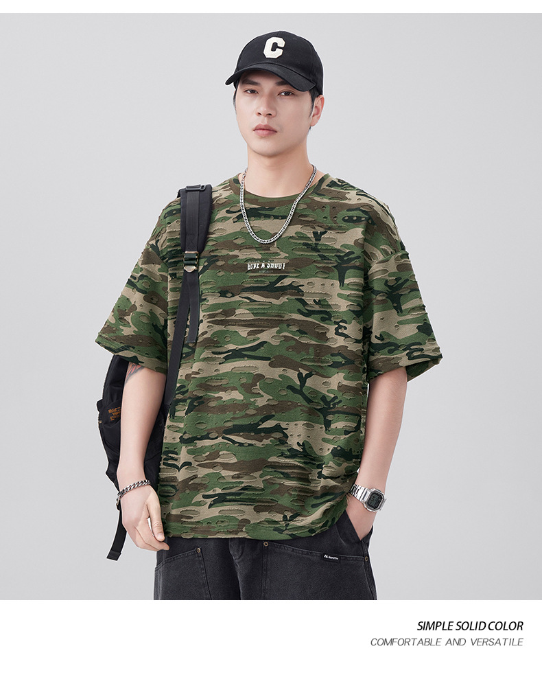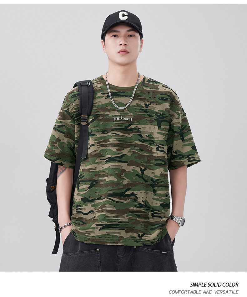 潮牌重磅迷彩破洞短袖T恤男夏季美式潮流印花宽松大码薄款休闲T恤