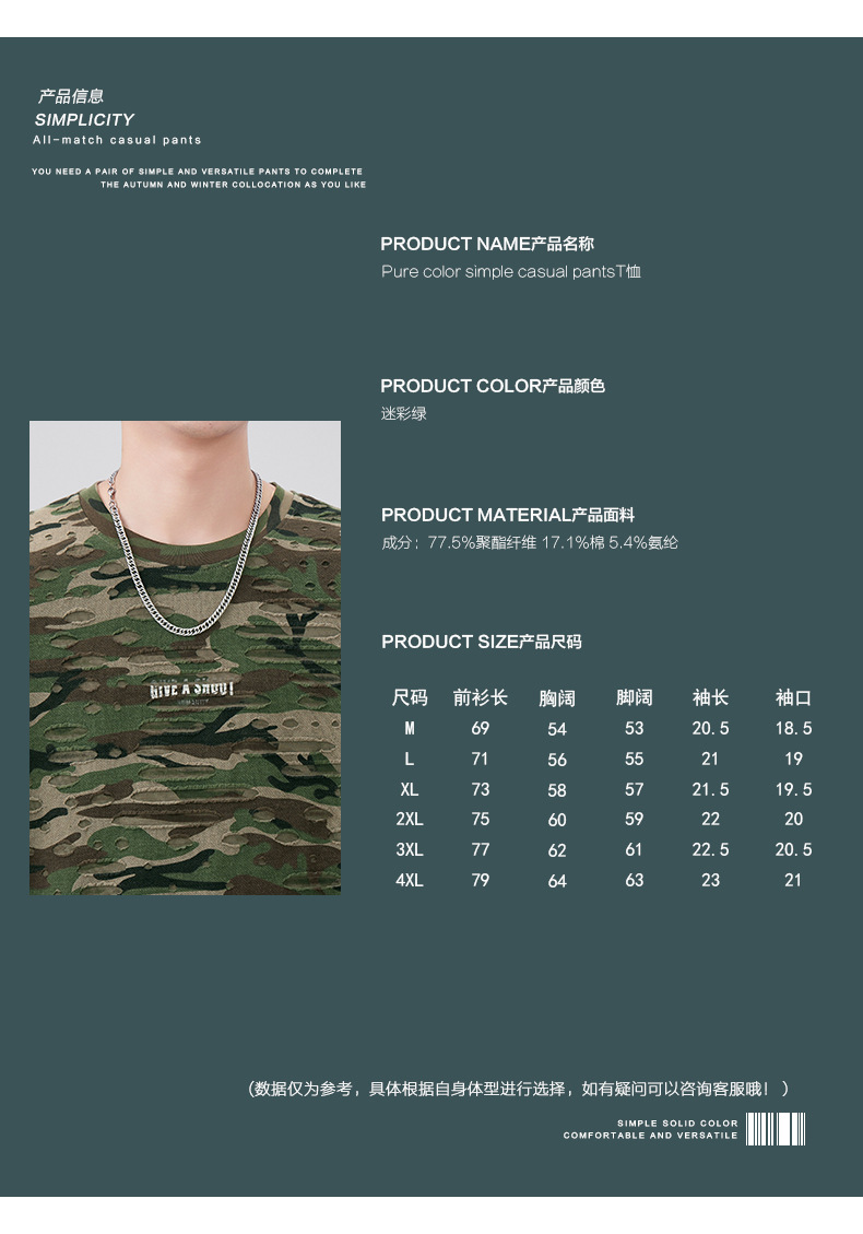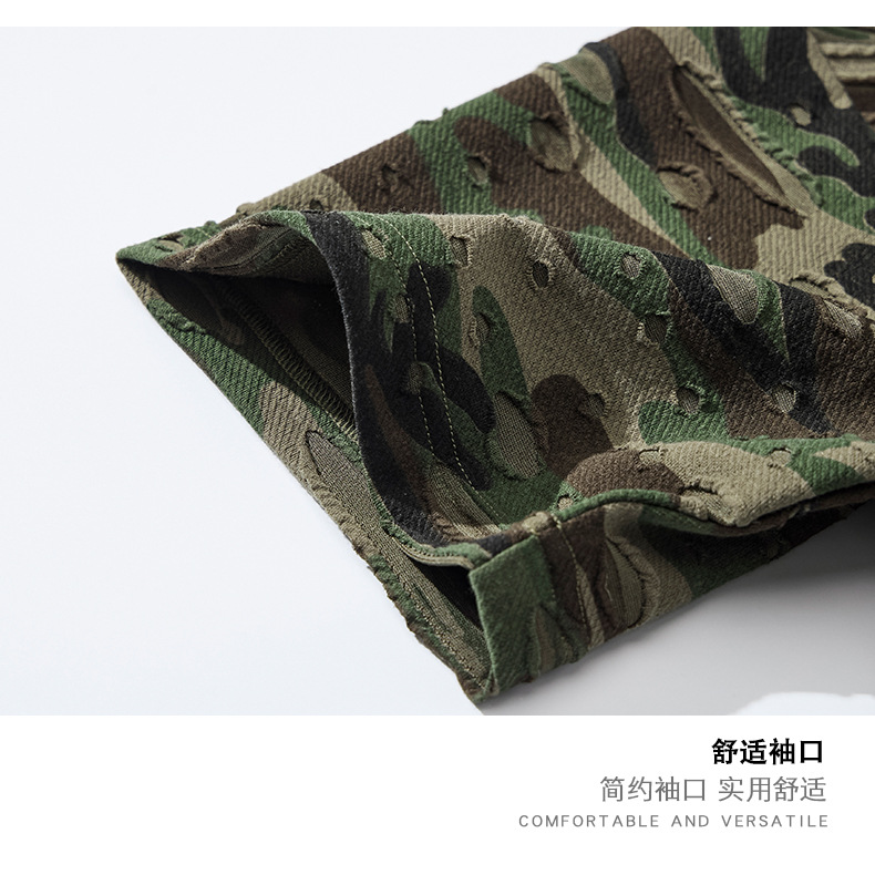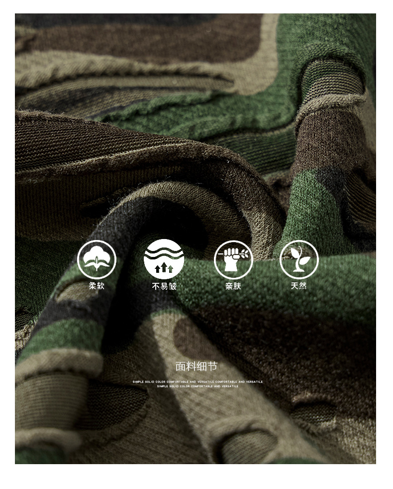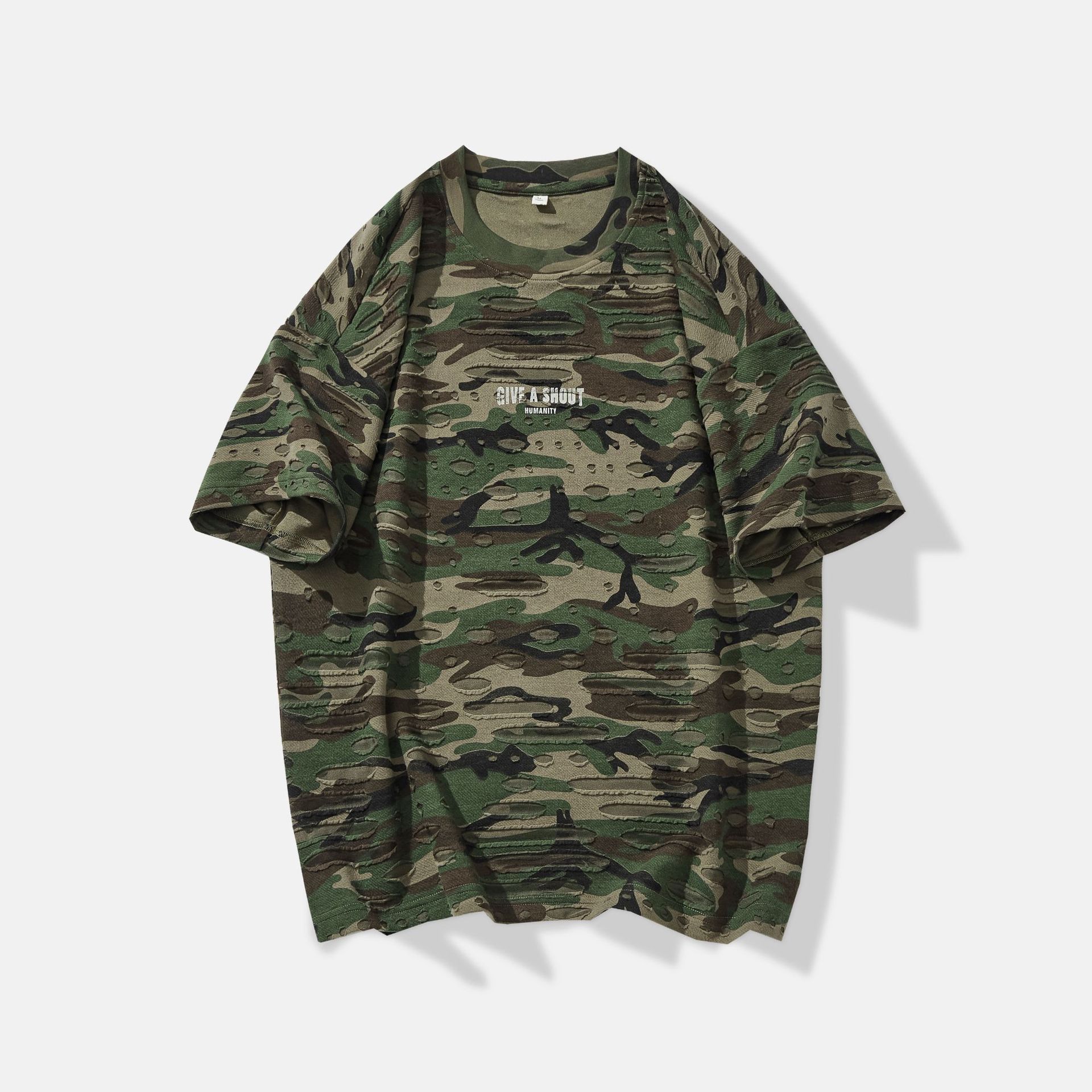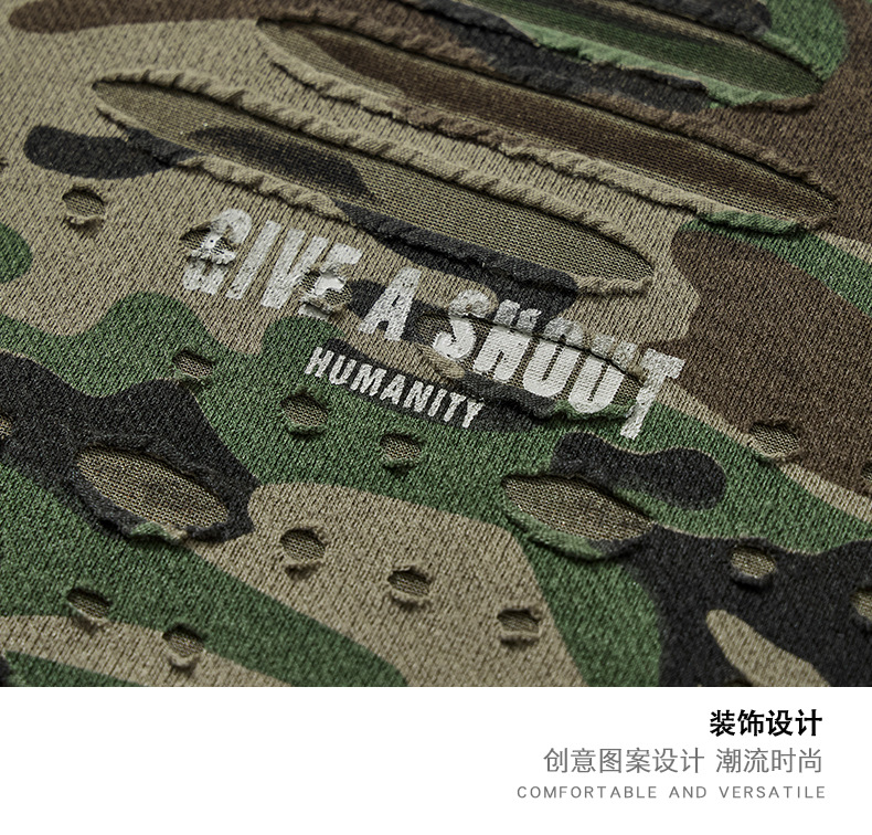 潮牌重磅迷彩破洞短袖T恤男夏季美式潮流印花宽松大码薄款休闲T恤