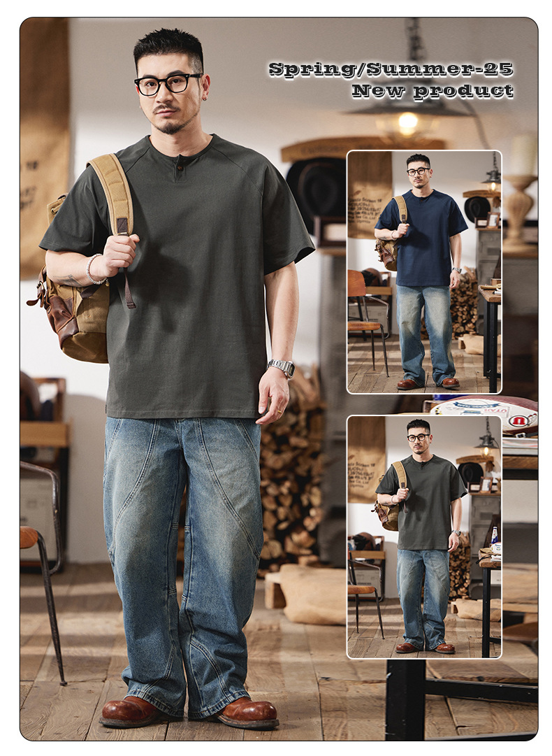 美式复古硬汉亨利领短袖t恤男夏季2025新款男士纯棉工装半袖上衣