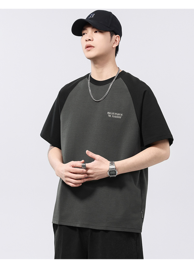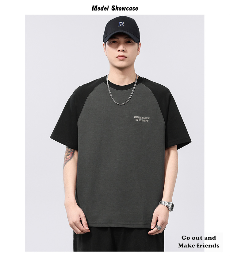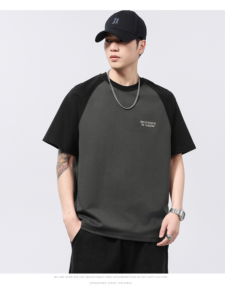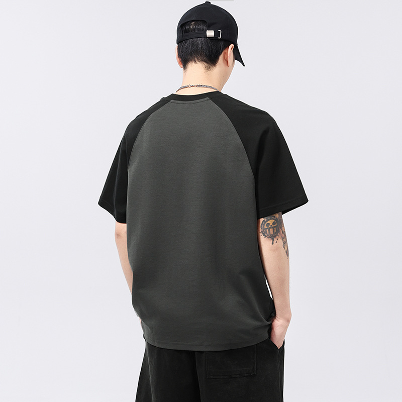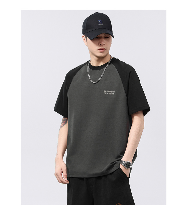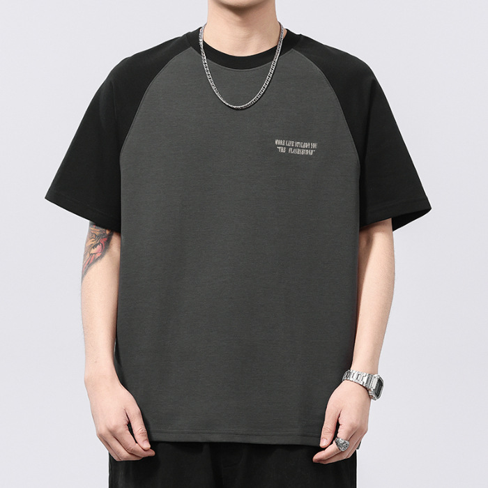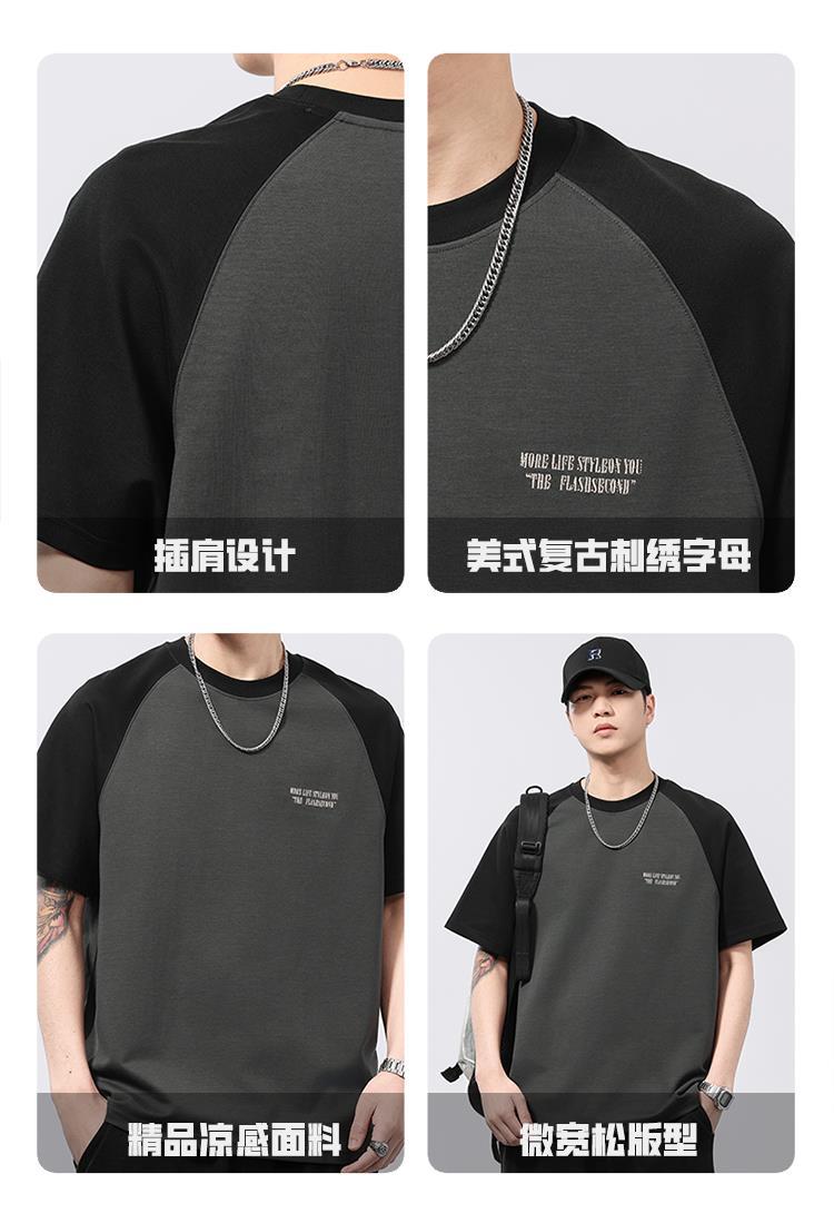 夏季黑灰色男士短袖t恤衫宽松潮牌拼色插肩高级感半袖体恤衫上衣