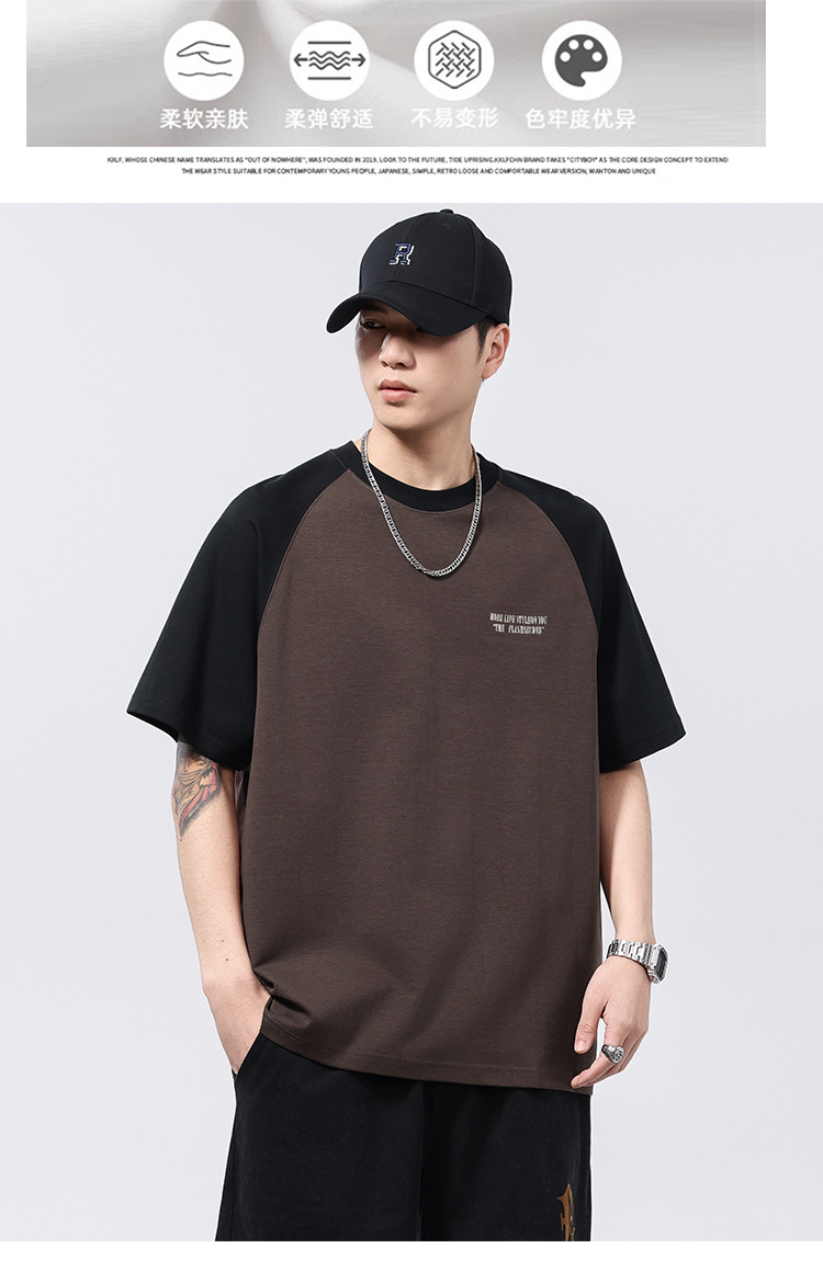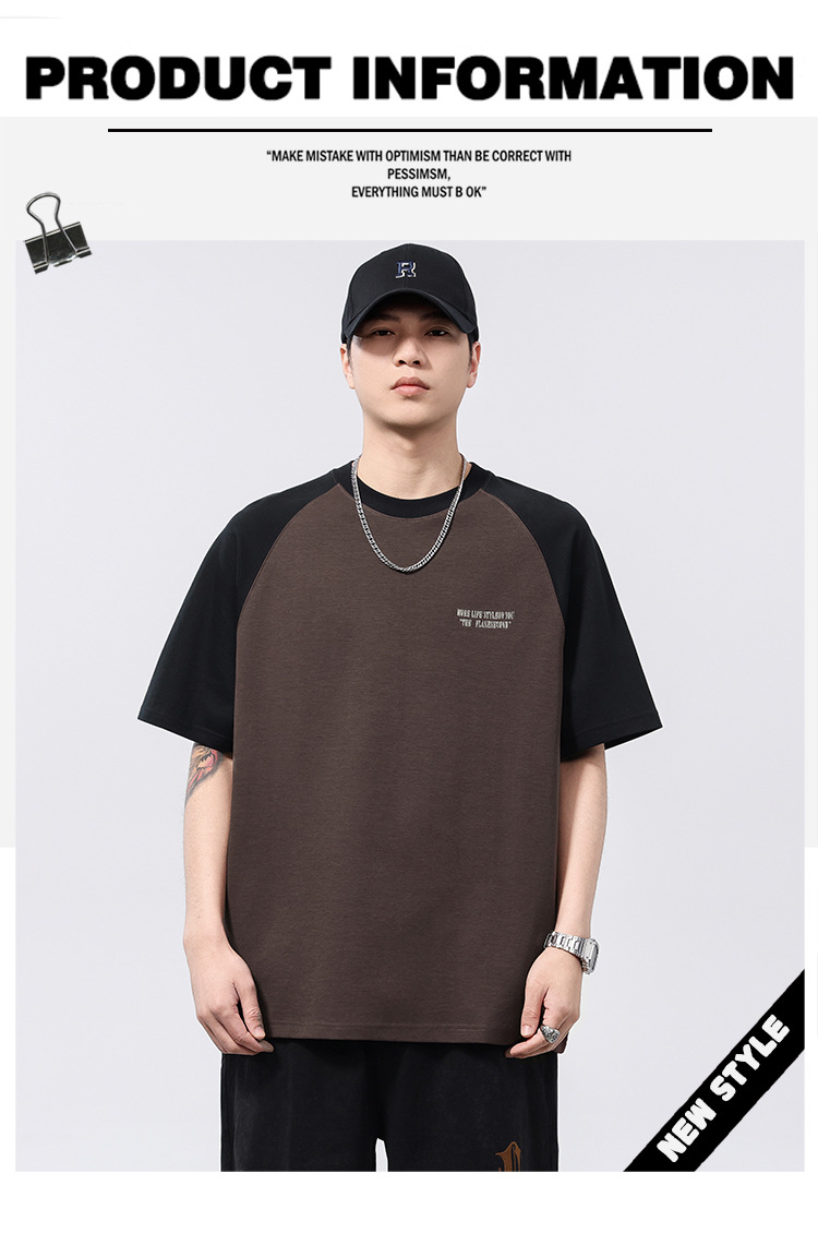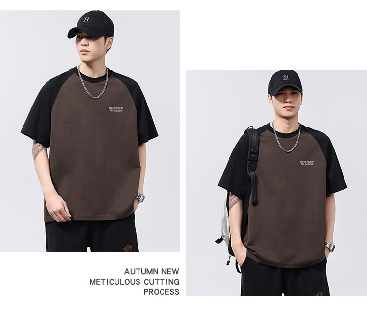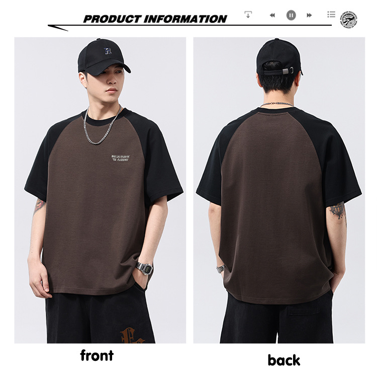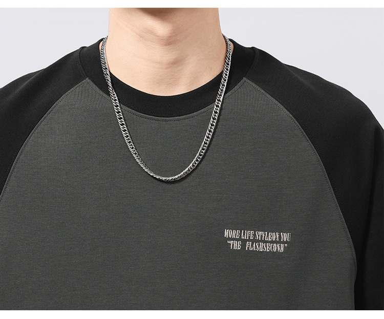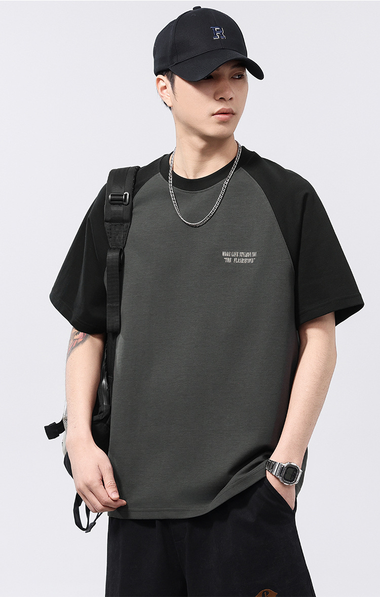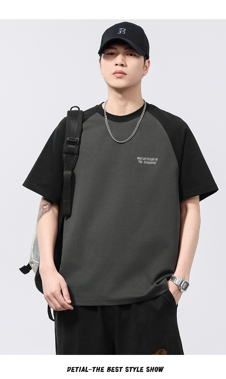 夏季黑灰色男士短袖t恤衫宽松潮牌拼色插肩高级感半袖体恤衫上衣