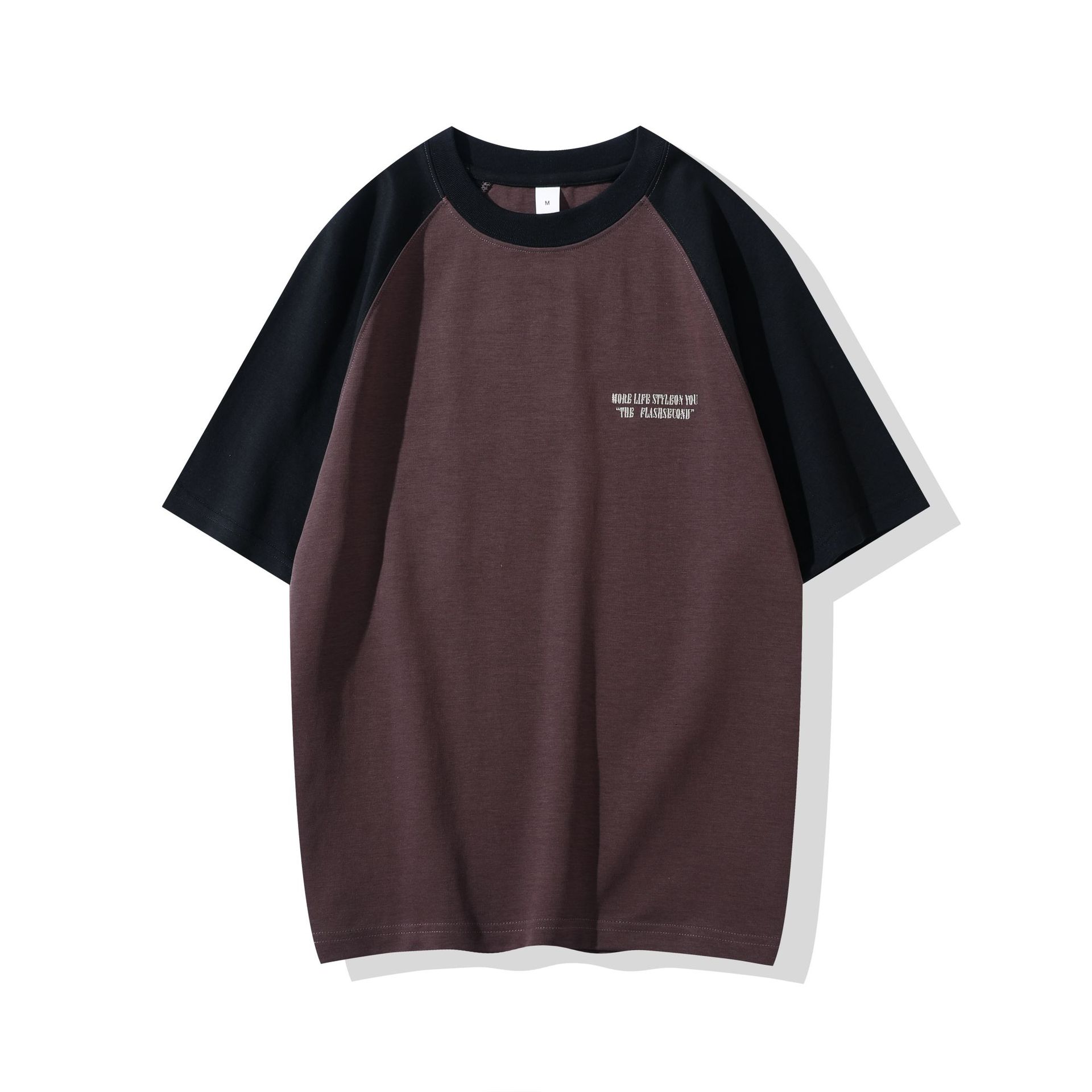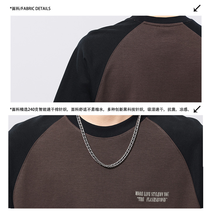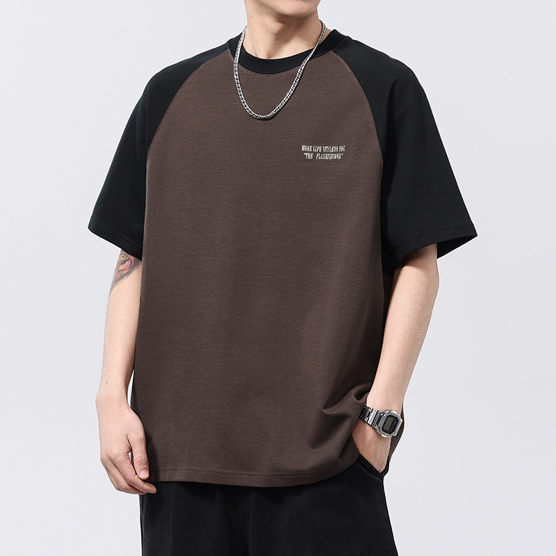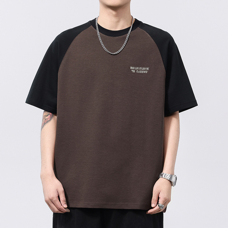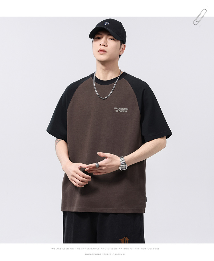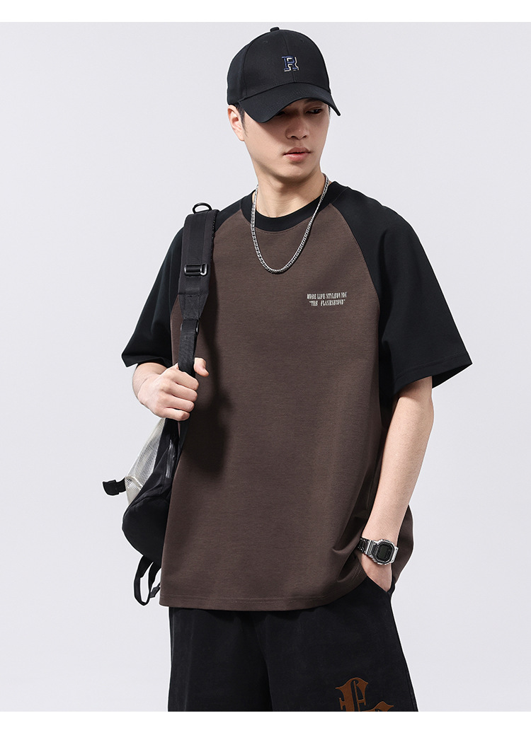 夏季黑灰色男士短袖t恤衫宽松潮牌拼色插肩高级感半袖体恤衫上衣