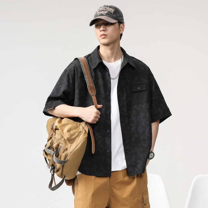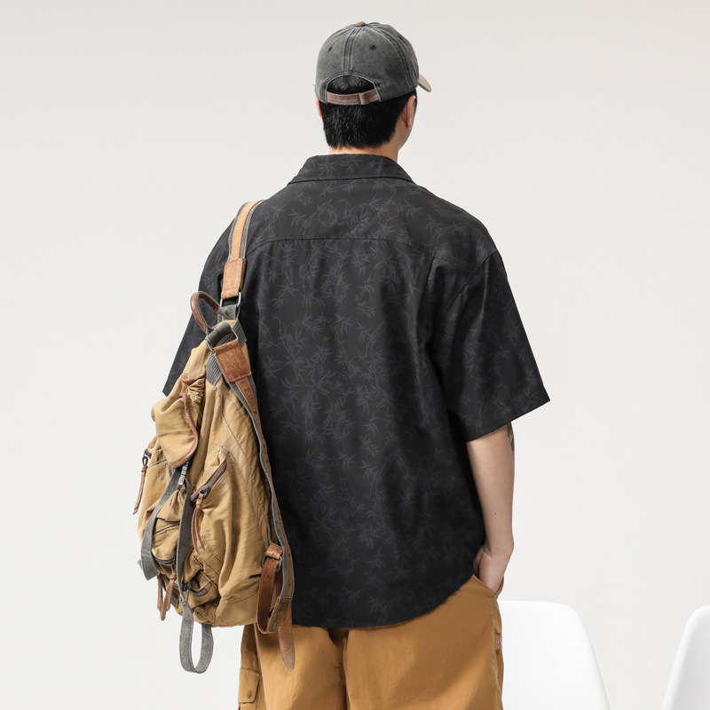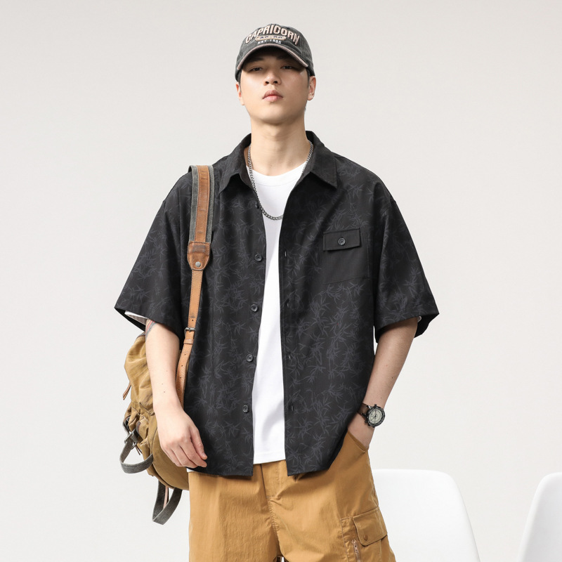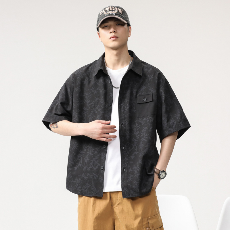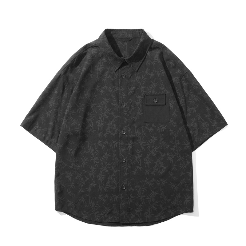 高级感花纹冰丝短袖衬衫男薄款宽松大码新中式竹叶国风免烫衬衣潮