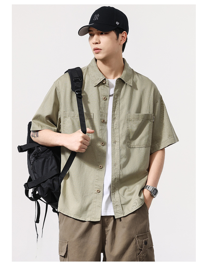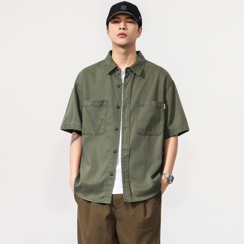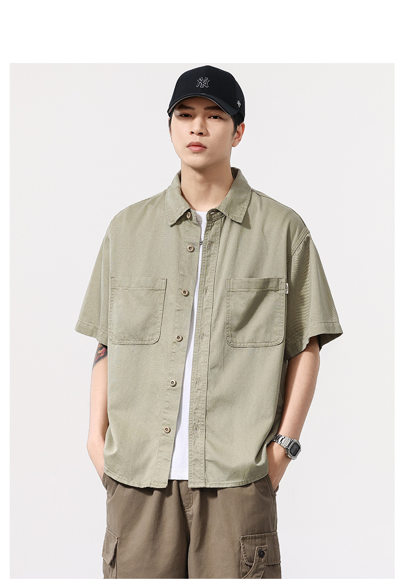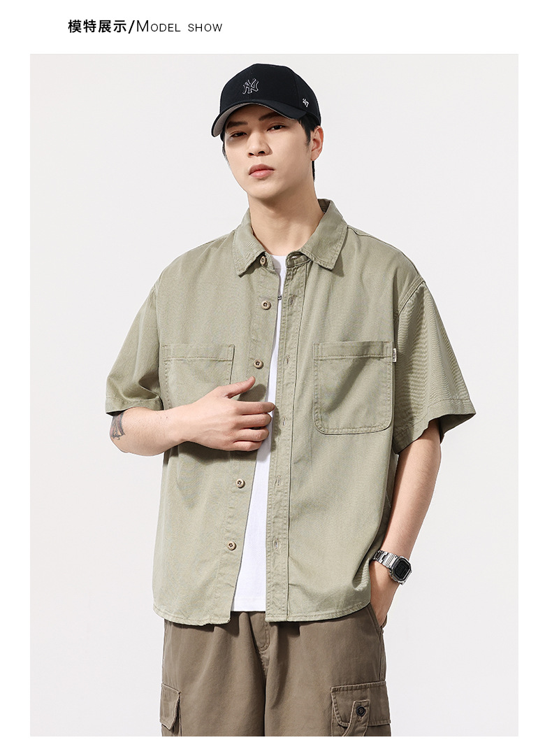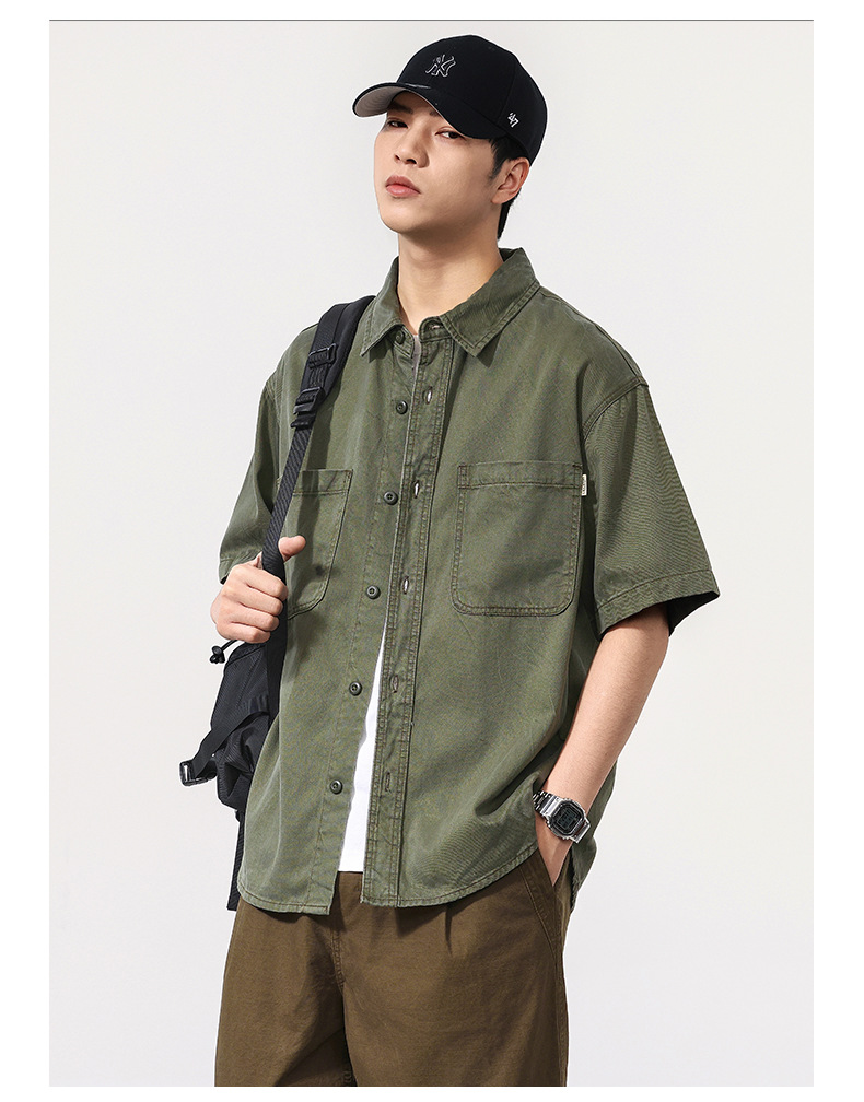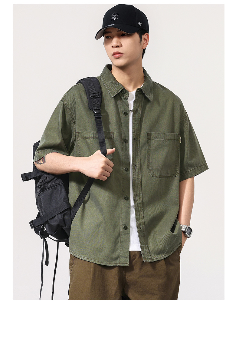 夏季新款美式复古水洗短袖衬衫男士上衣宽松休闲T恤开衫衬衣