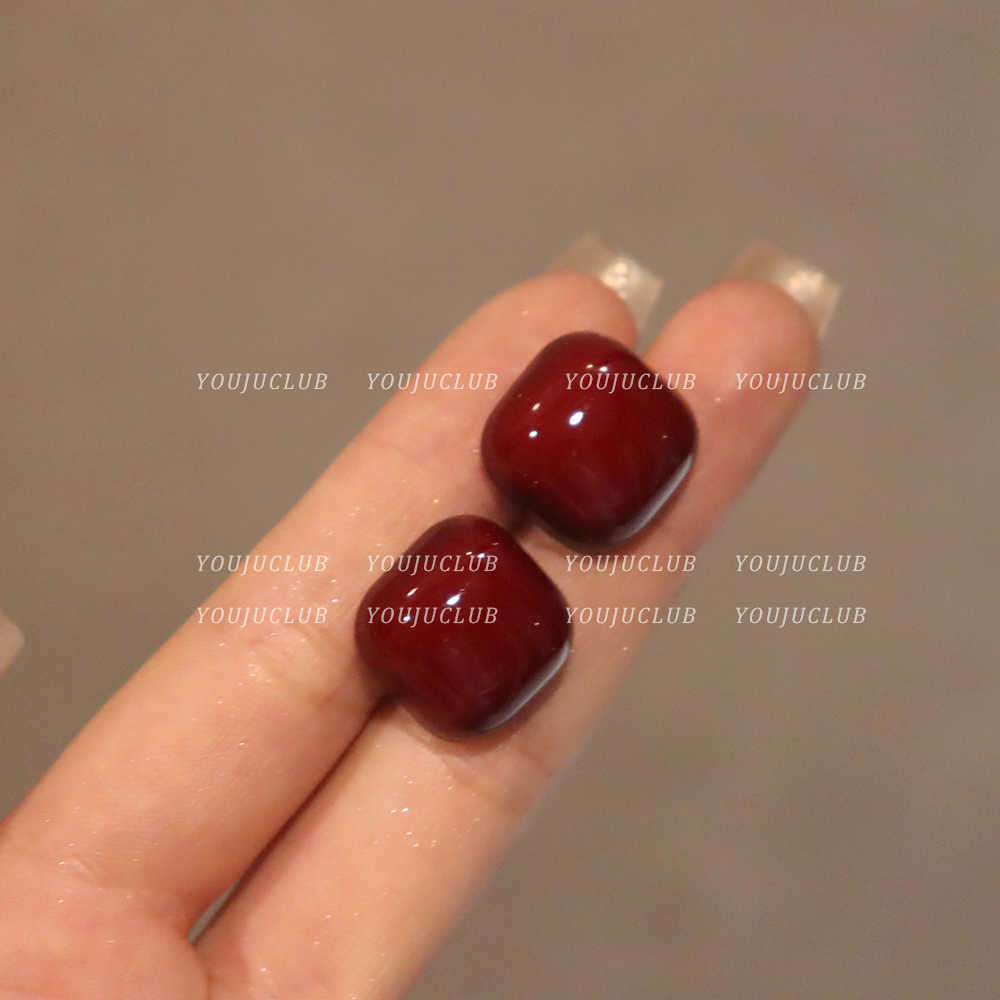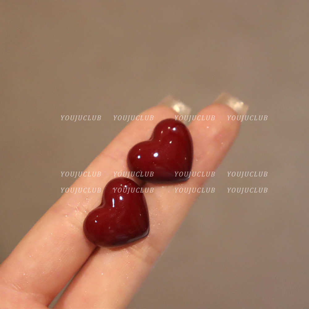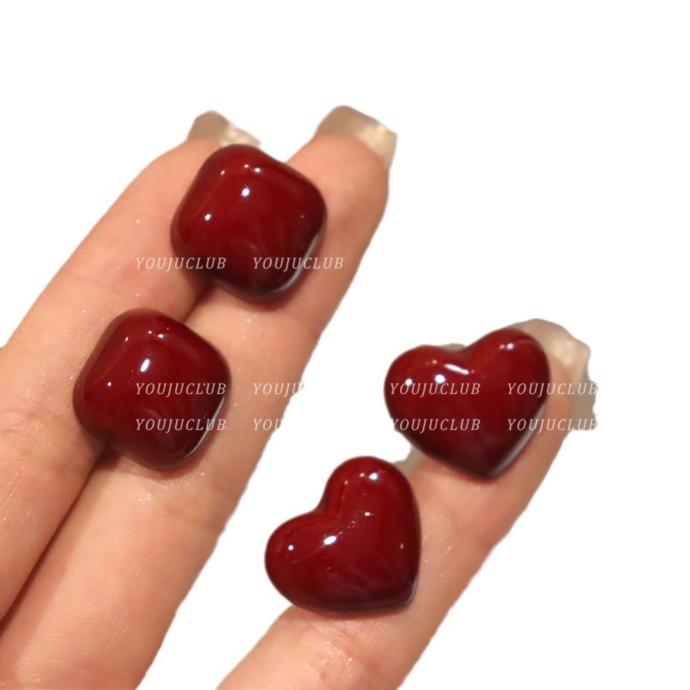 超显白~安可拉红复古爱心方形酒红色气质耳钉轻奢高级感小众耳环
