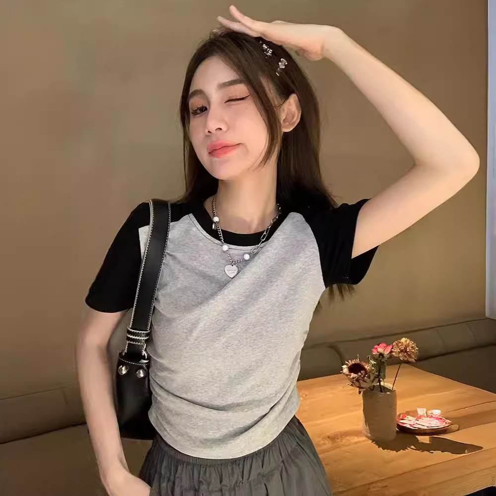 美式复古T恤女夏季2025新款正肩圆领打底衫修身撞色插肩短袖上衣
