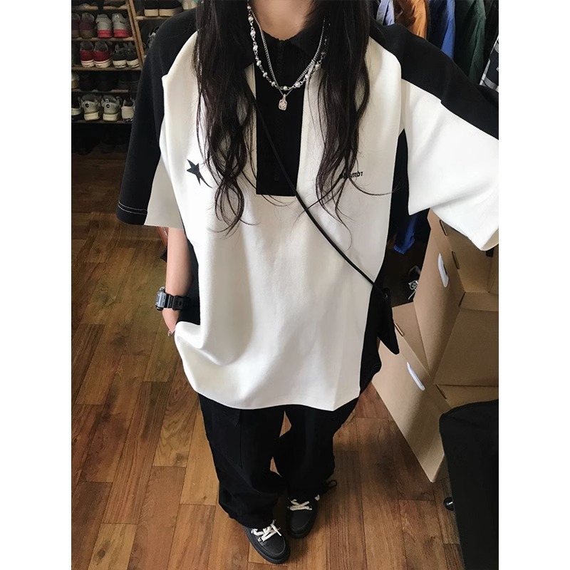 美式复古polo领半拉链短袖T恤女宽松夏季撞色中长款体恤正肩上衣
