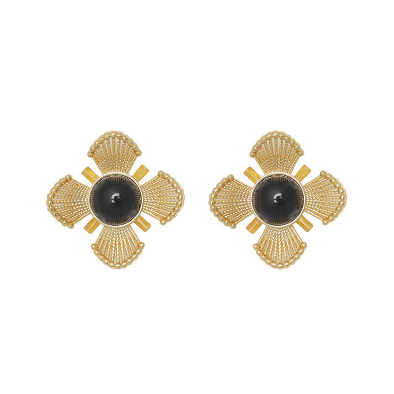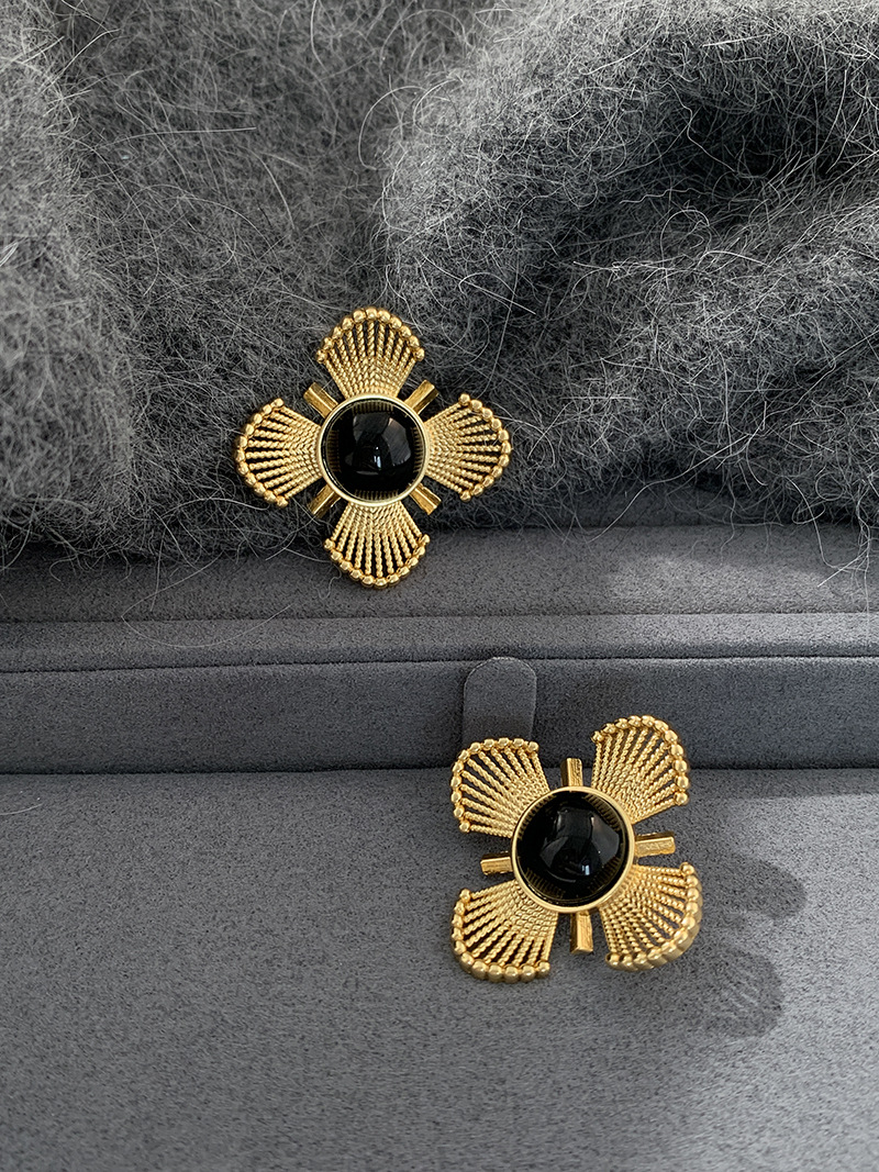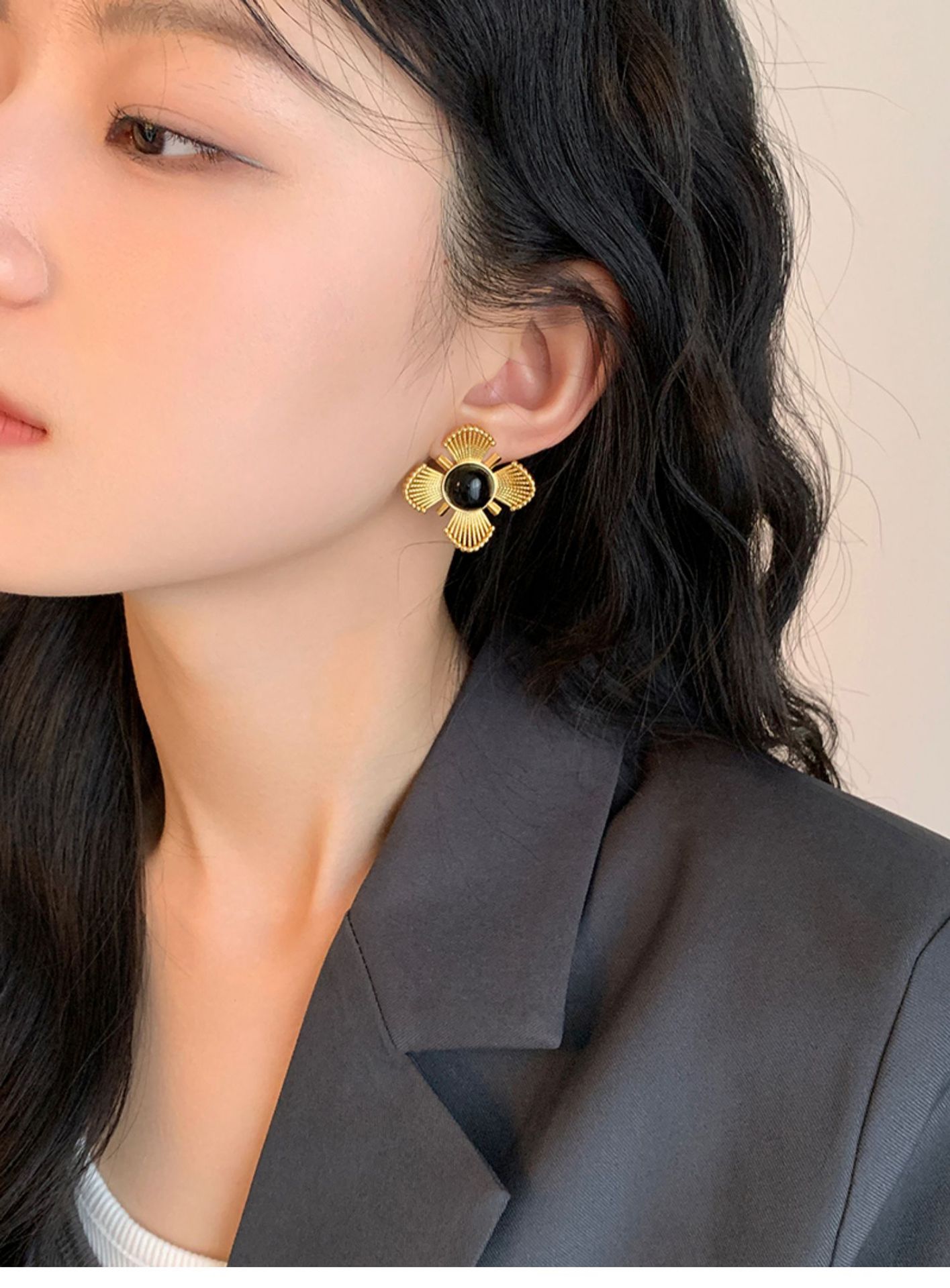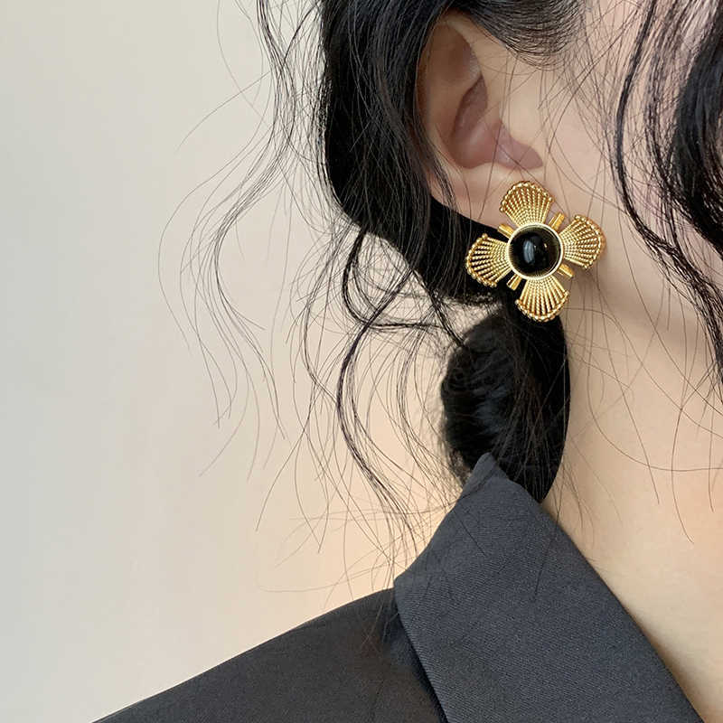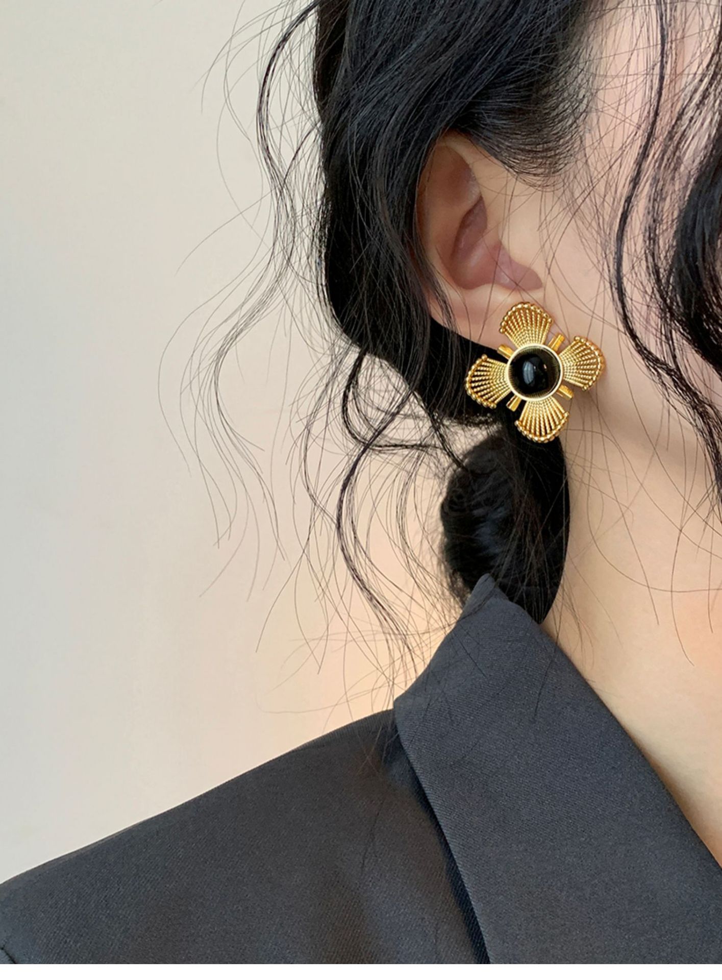 迷度S925银针小众中古重工黑金沙镂空花朵耳钉黑玛瑙耳环夸张耳饰