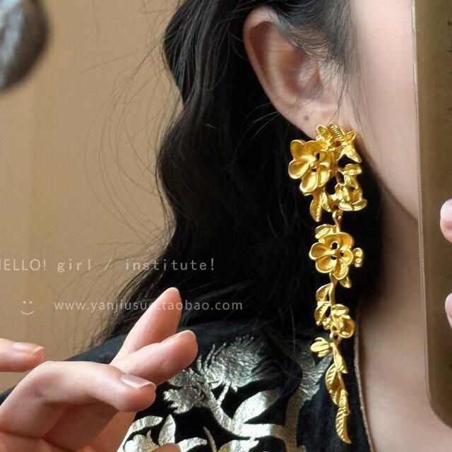 复古鎏金花朵流苏耳环女秋冬轻奢高级感耳钉小众夸张气质耳坠耳饰