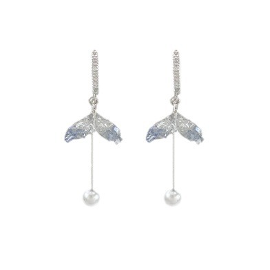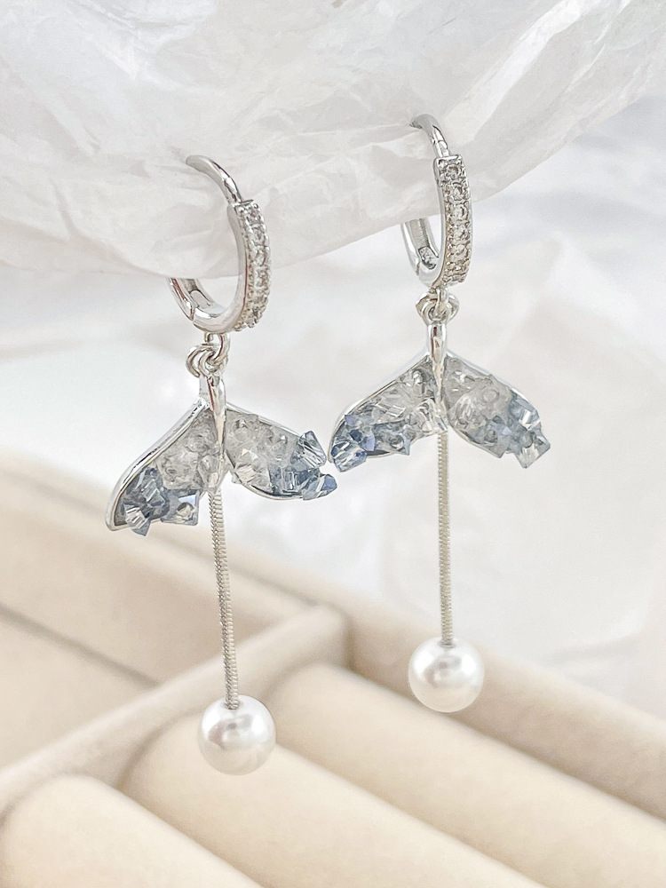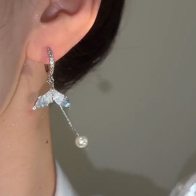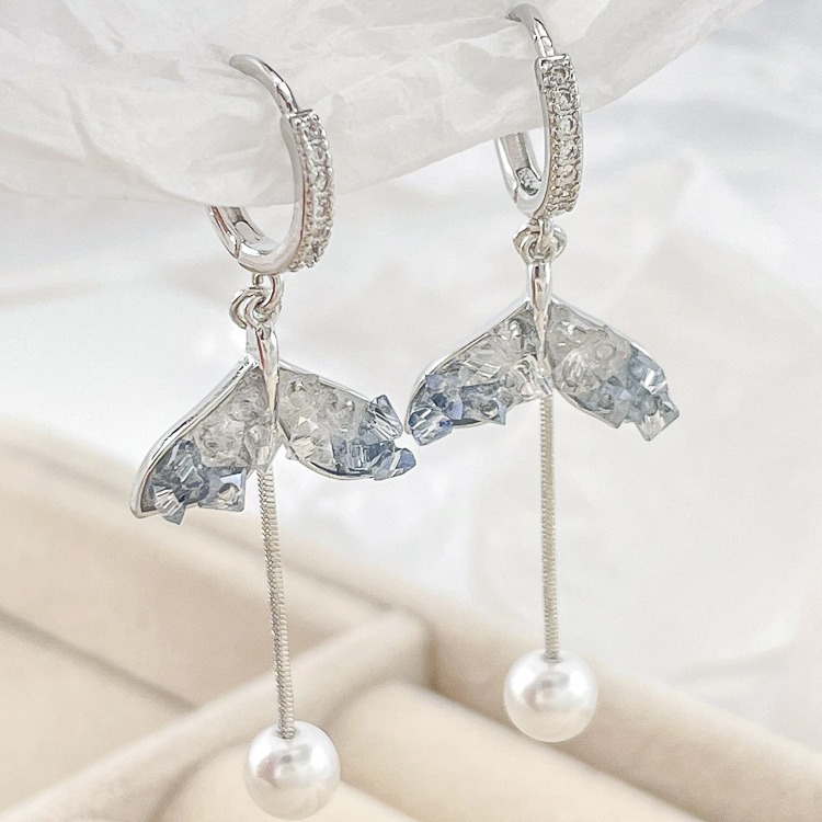 蓝色水晶人鱼尾珍珠耳环高级感小众设计流苏耳坠气质优雅新款耳饰