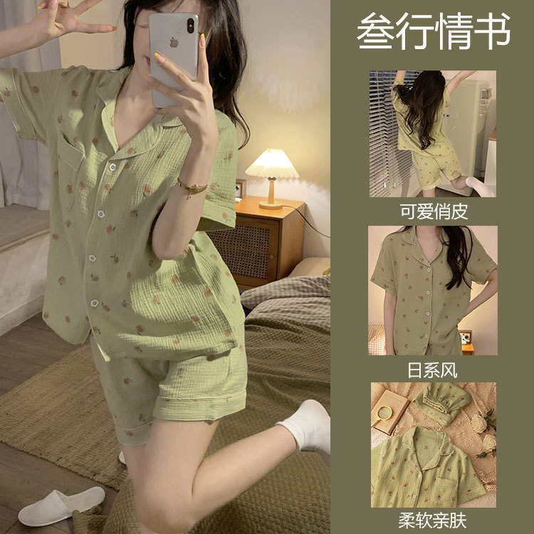 睡衣女夏季短袖日系女士睡衣套装新款绿色开衫家居服两件套