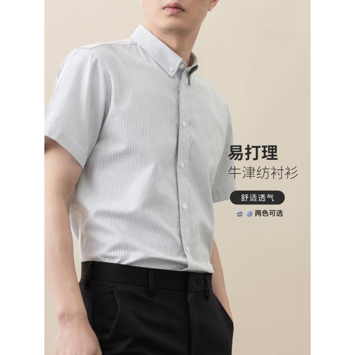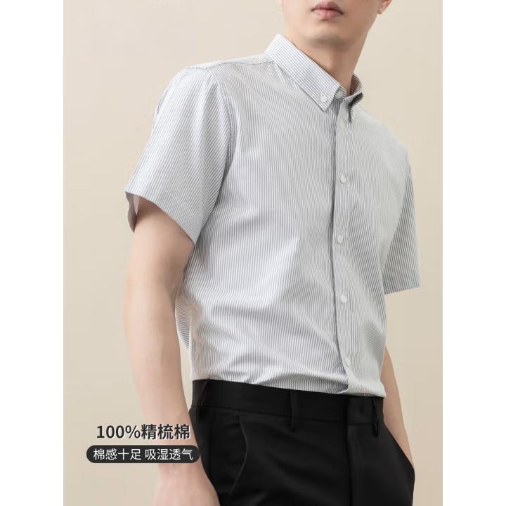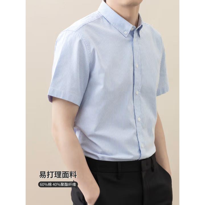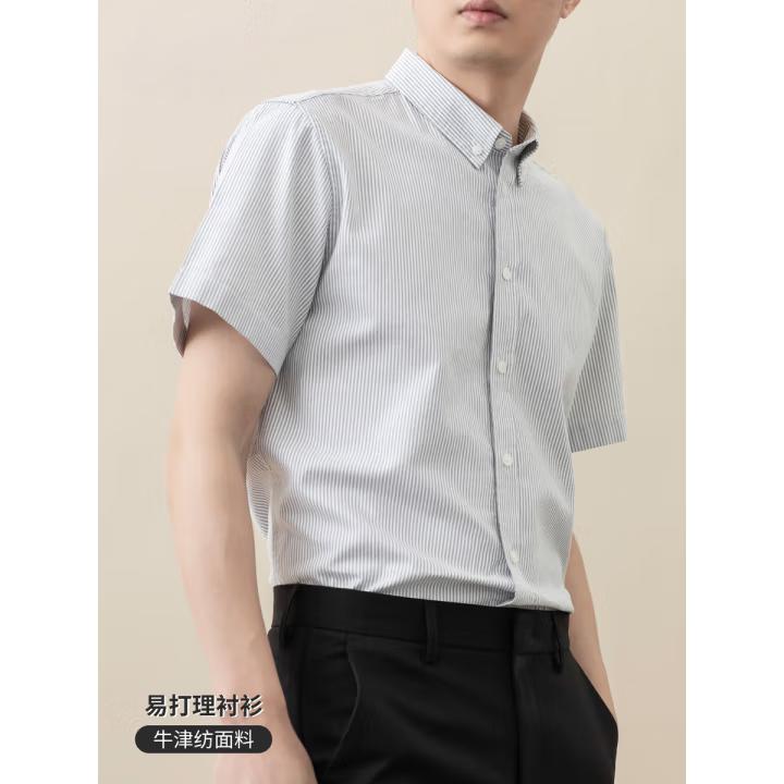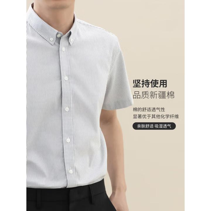 纯棉牛津纺竖条纹短袖衬衫男全棉免烫抗皱男士商务休闲衬衣