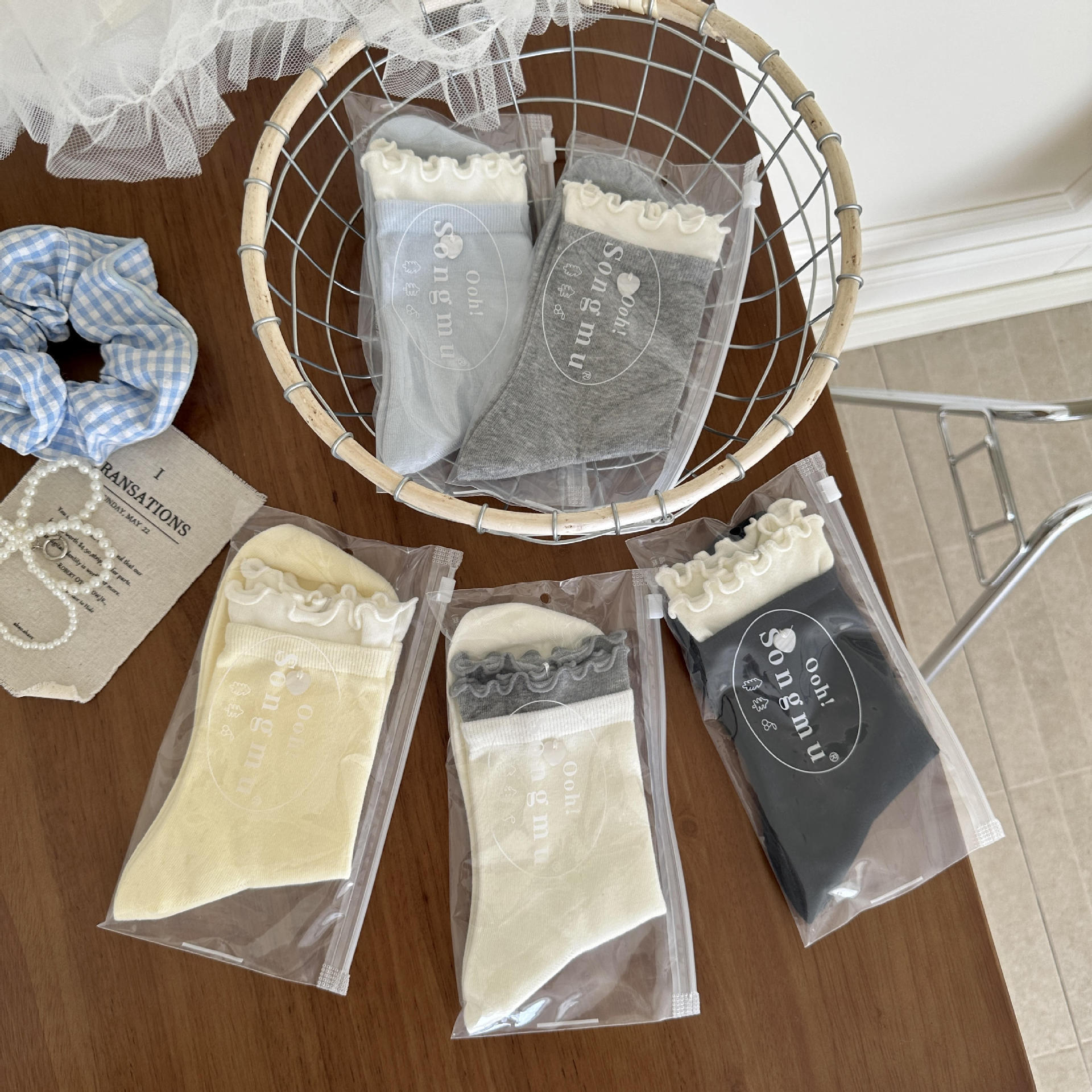 Songmu‘爱心扣子木耳边撞色堆堆袜韩系中筒袜ins精梳棉小清新袜