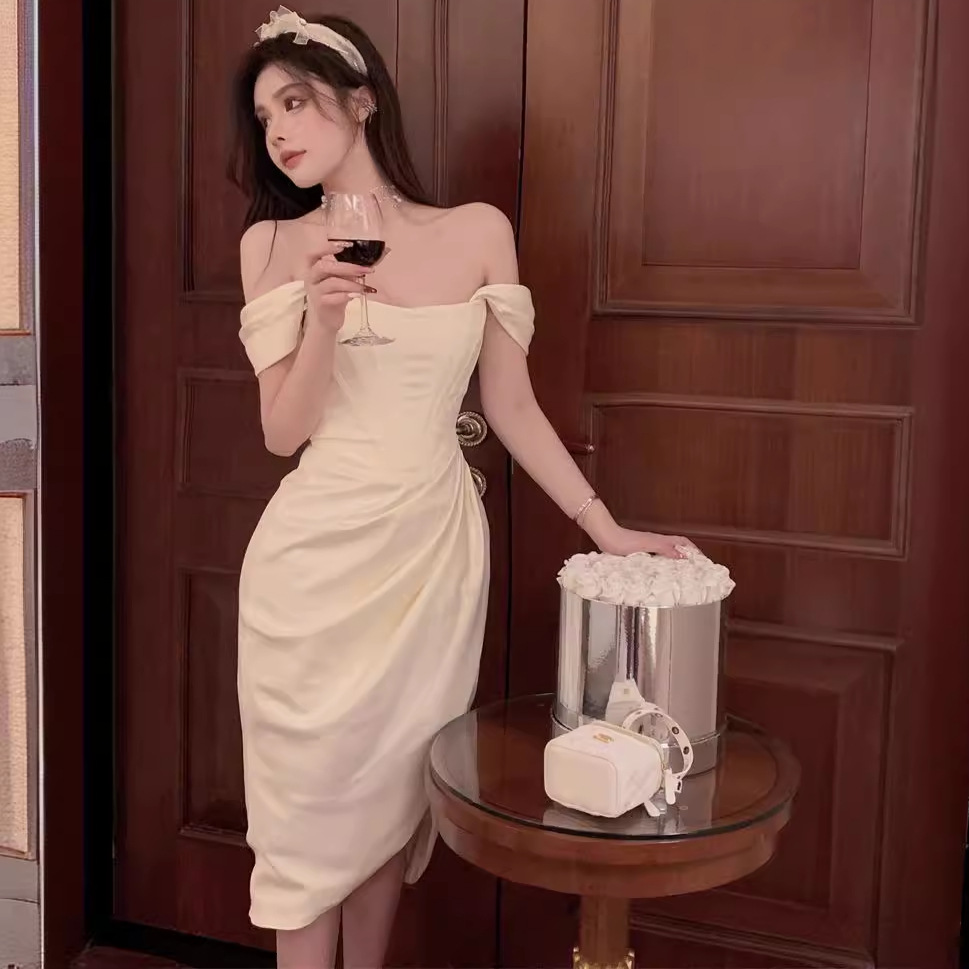 名媛气质女一字领褶肩带鱼骨束腰宫廷显瘦开叉连衣裙礼服裙