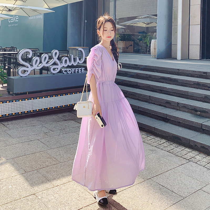 法式茶歇收腰高级感长裙子夏季新款甜美气质紫色连衣裙女