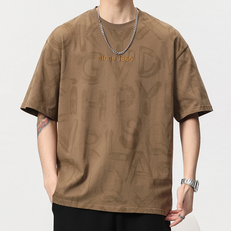 美式卡其色半袖T恤男宽松大码夏季新款字母满印刺绣套头短袖