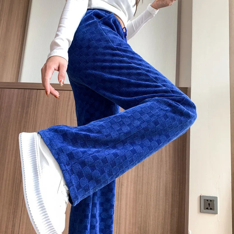 克莱因蓝雪尼尔阔腿裤女秋冬薄款直筒宽松休闲裤垂感棋盘格拖地裤