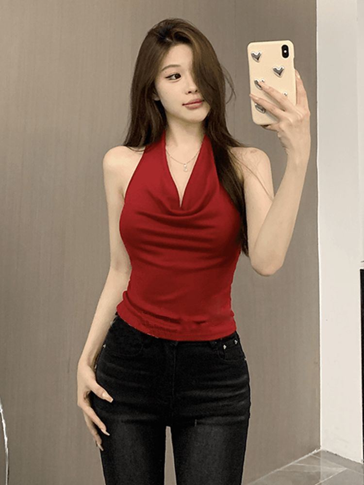 【跨境批发】红色露背荡领无袖背心女夏新款性感甜辣修身挂脖上衣