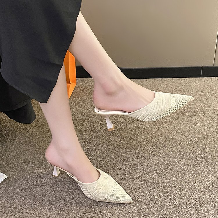 夏季夏季针织包头半拖鞋女外穿透气细跟尖头大码41高跟鞋