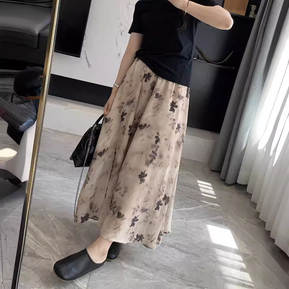 温柔水墨花朵裙垂感高腰半身长裙气质飘逸通勤A字中长裙女夏新