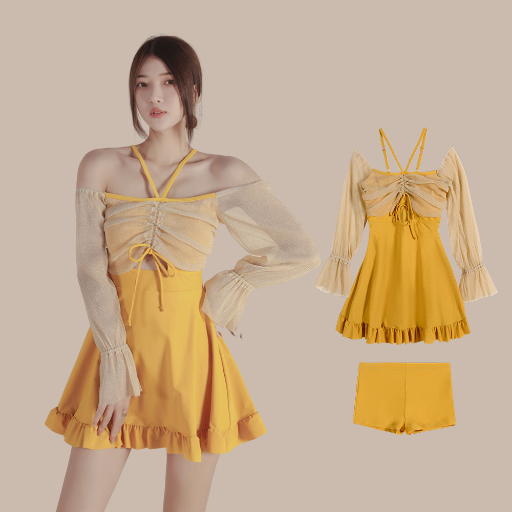 保守长袖连体泳衣女网纱防晒葫芦岛泳装韩版显瘦半裙温泉度假泳衣