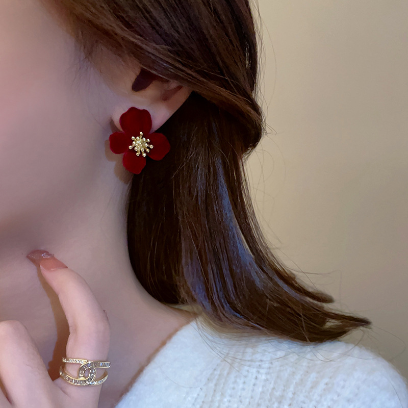 925银针丝绒花朵耳环高级感轻奢耳钉气质高级大气秋冬红色耳饰女
