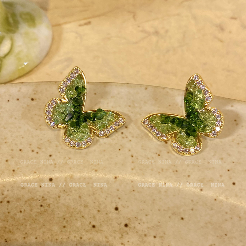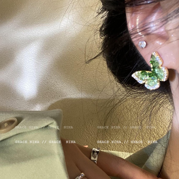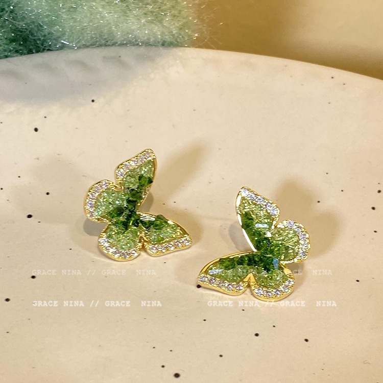 森系绿水晶蝴蝶耳钉酷夏季新款耳环小众设计感耳饰女时尚个性饰品