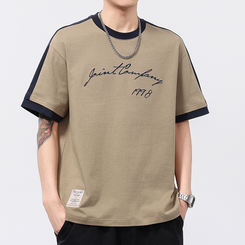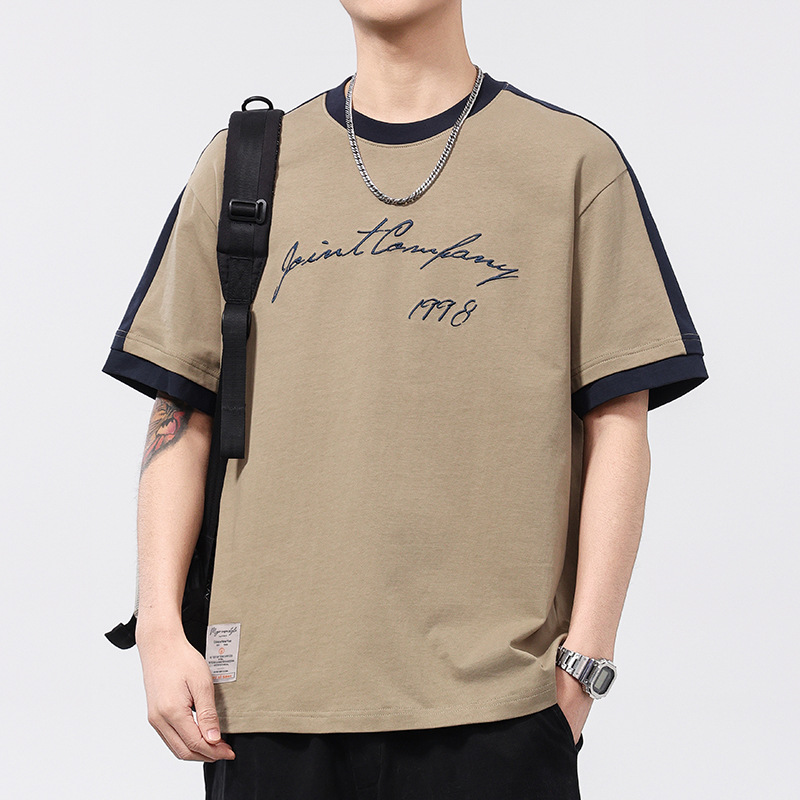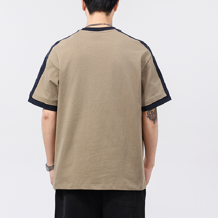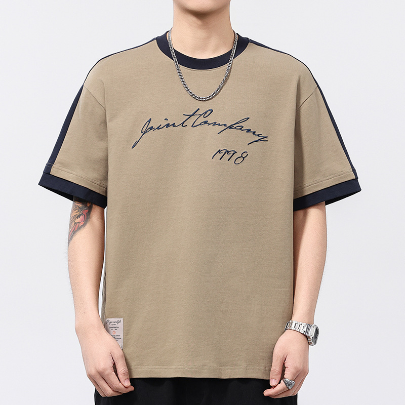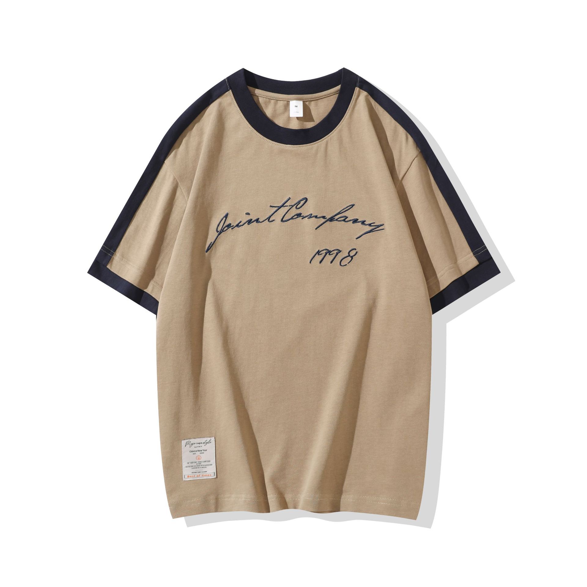 拼接撞色纯棉T恤男美式复古短袖夏季230g新款潮牌刺绣宽松上衣男