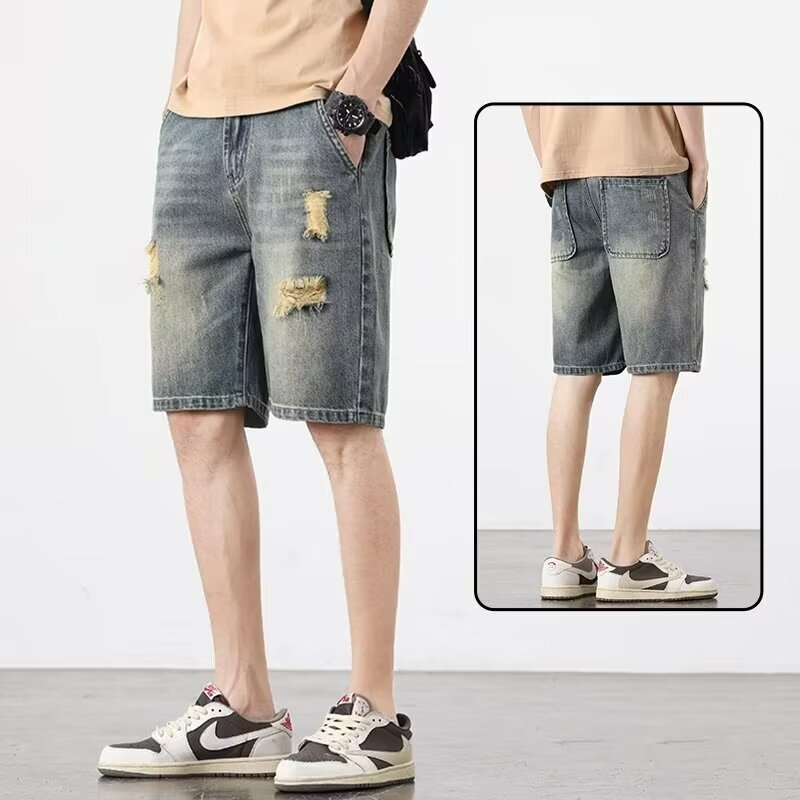 复古水洗牛仔短裤高街做旧五分中裤男夏季设计感宽松阔腿牛仔短裤