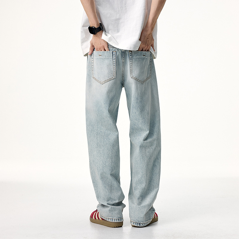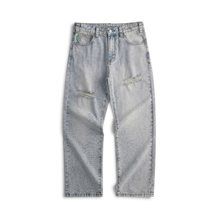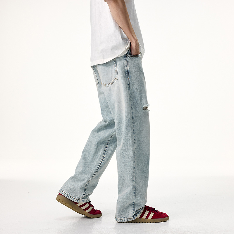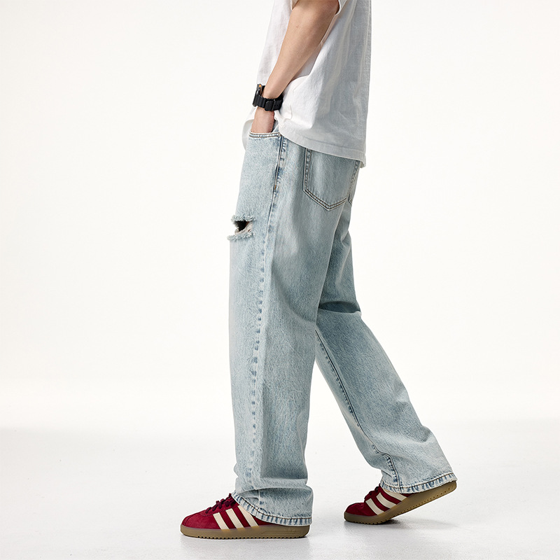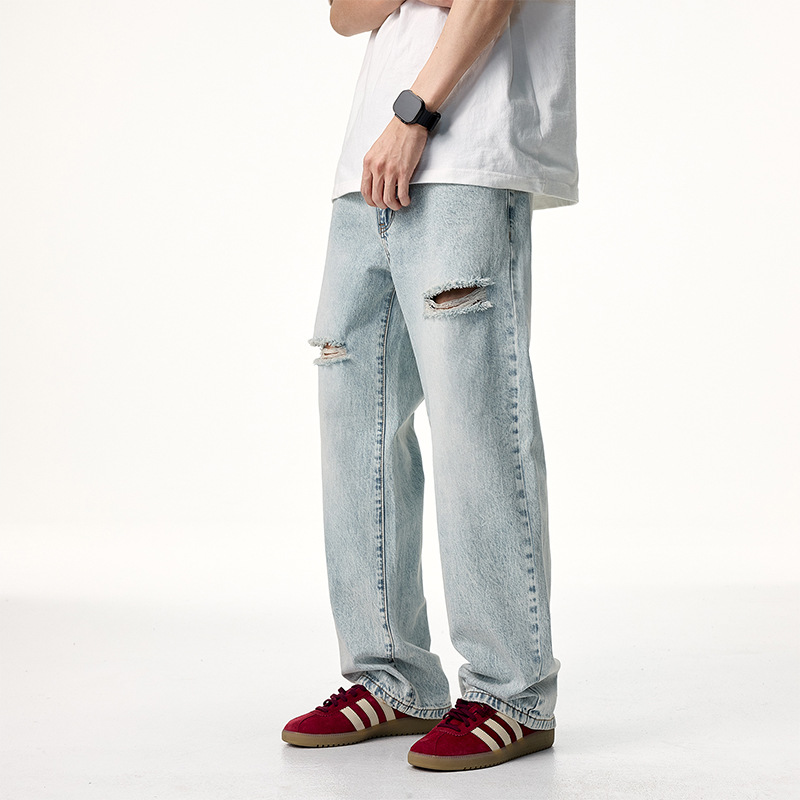 美式复古石青色破洞牛仔裤男春季潮牌宽松直筒男士磨白水洗休闲裤