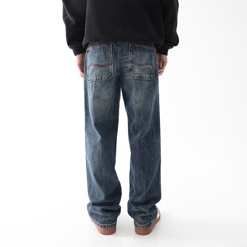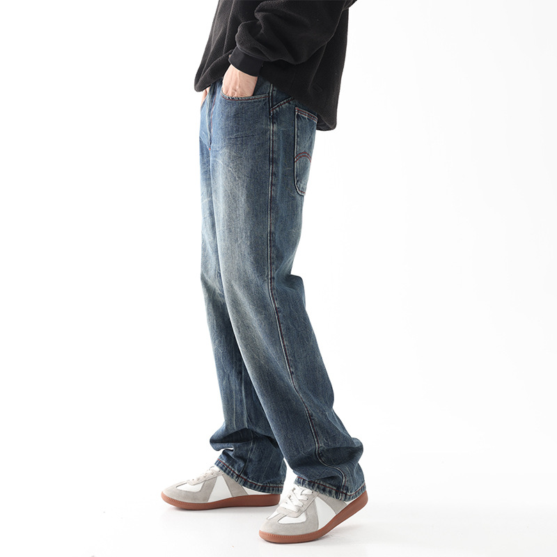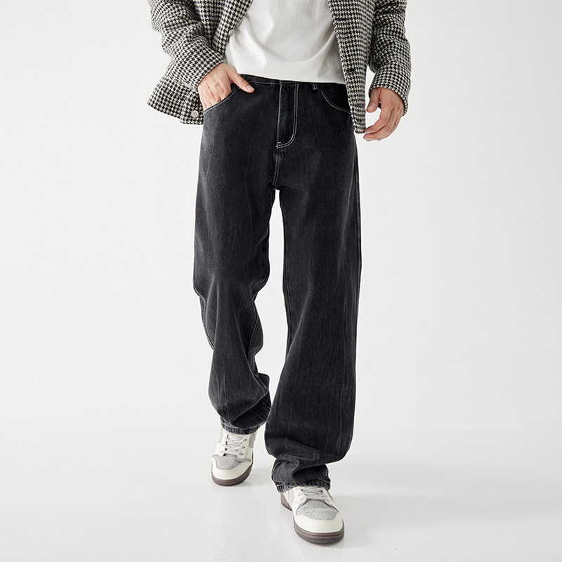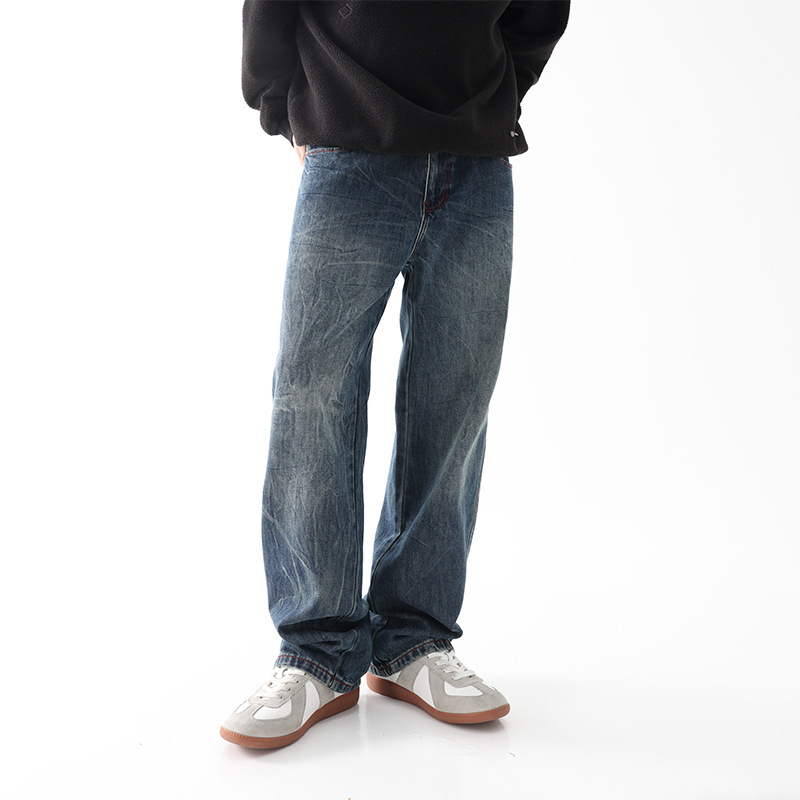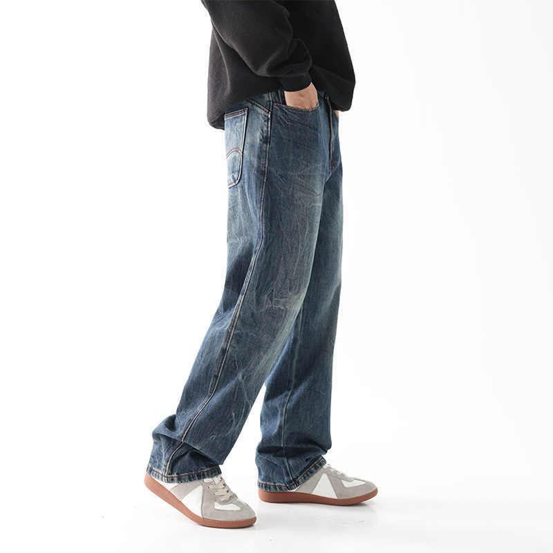 美式经典复古春季牛仔裤男宽松直筒男裤子爆裂纹重水洗休闲长裤男