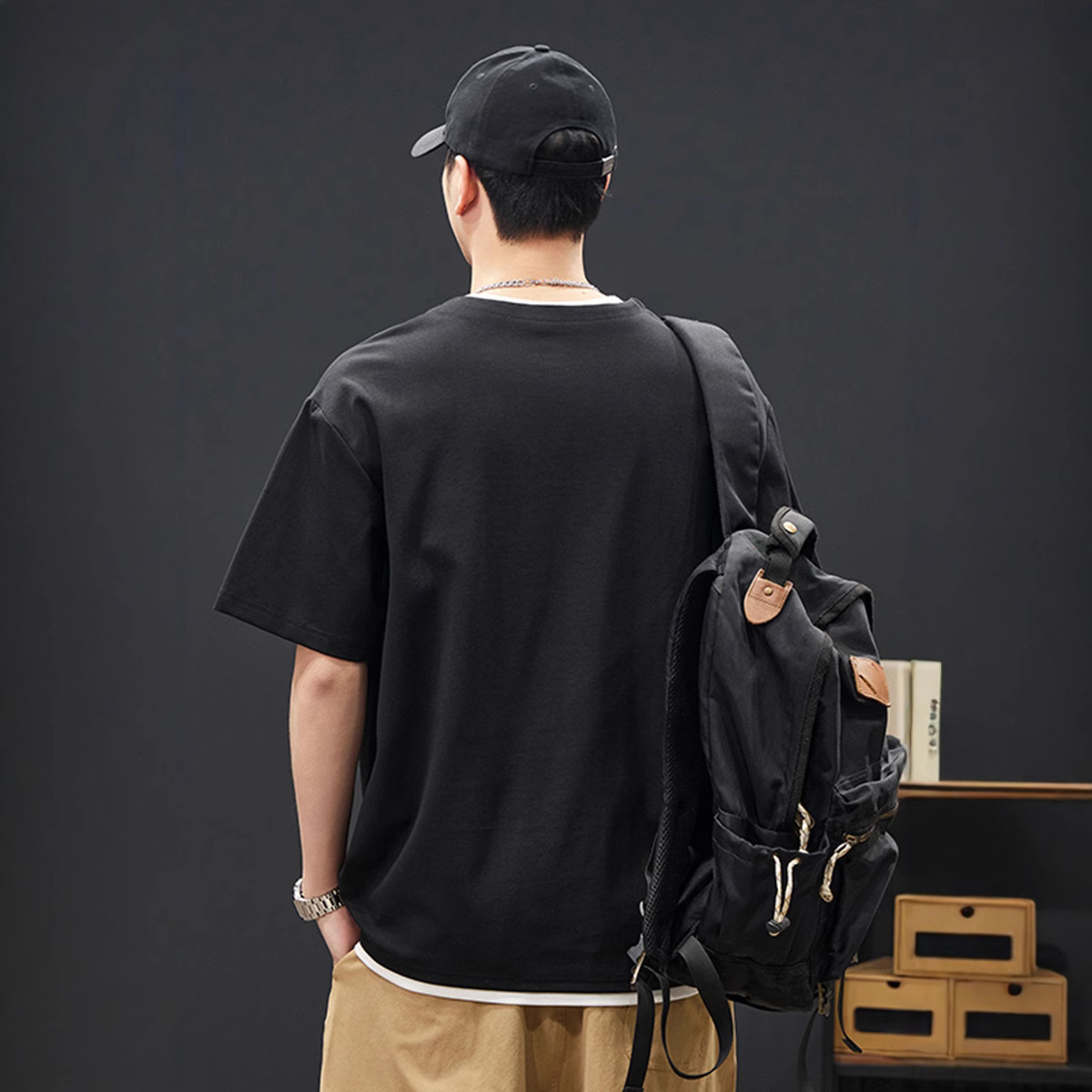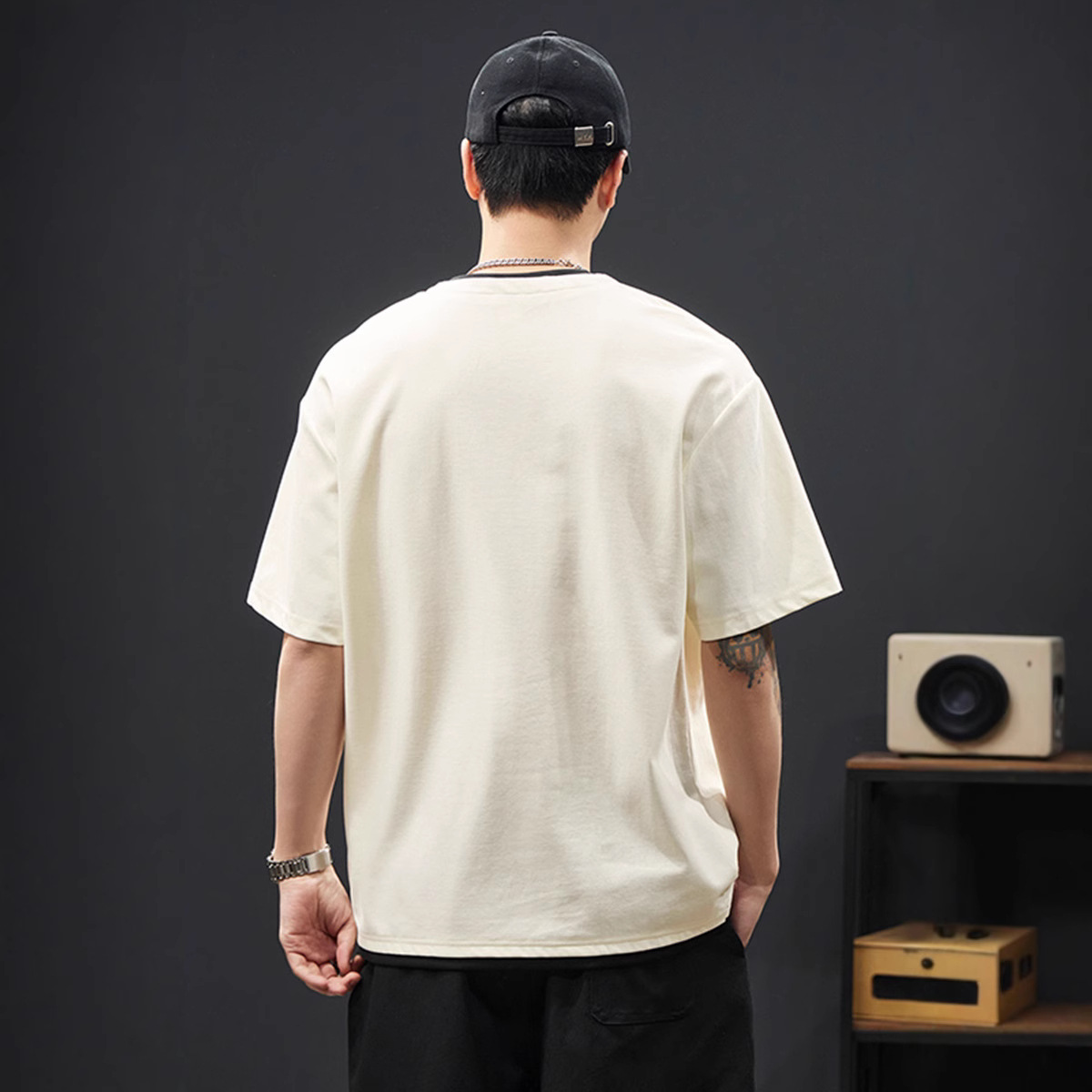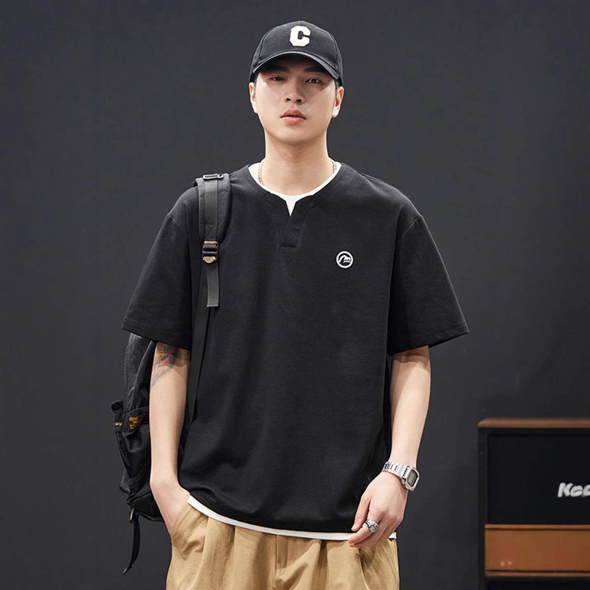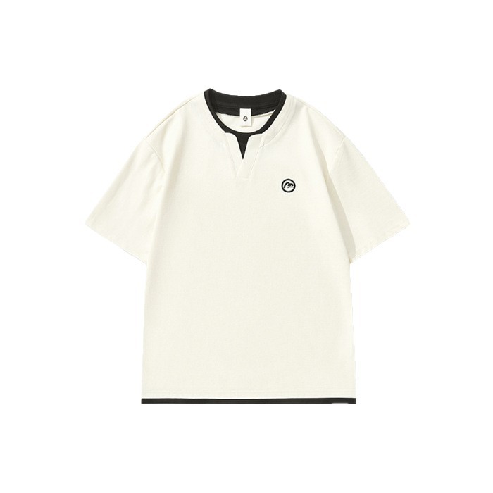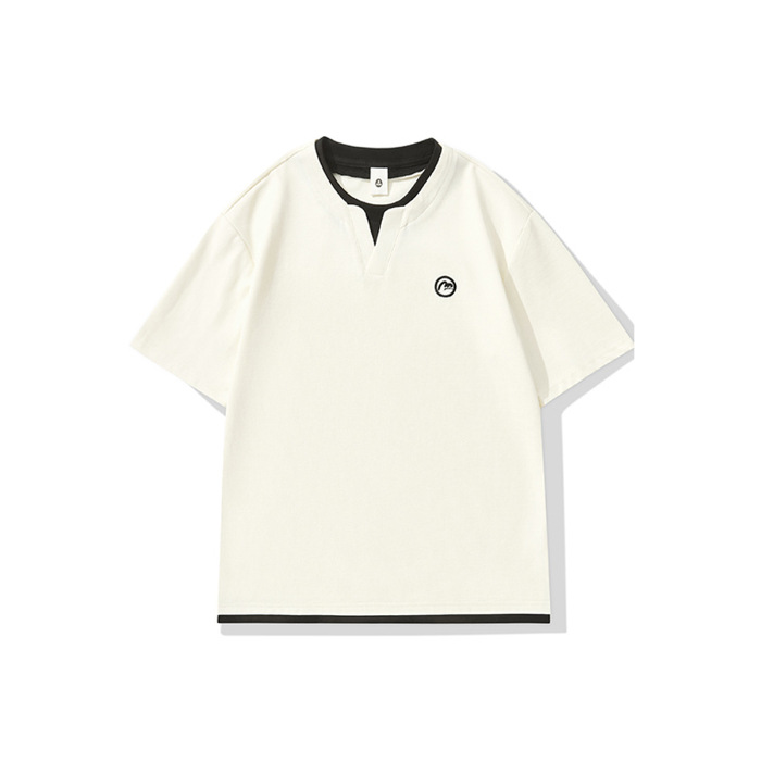 潮牌撞色拼接假两件男士短袖t恤夏季美式休闲宽松百搭V领休闲上衣