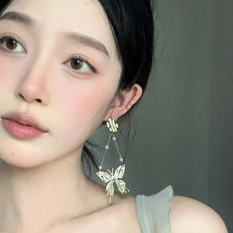 气质夸张蝴蝶珍珠耳环轻奢高级感小众设计感耳坠气质长款流苏耳饰