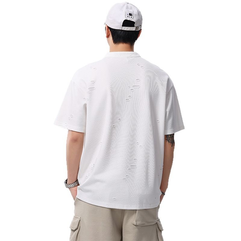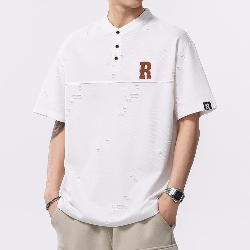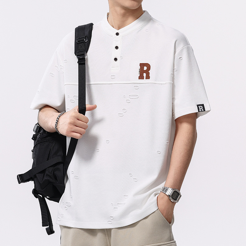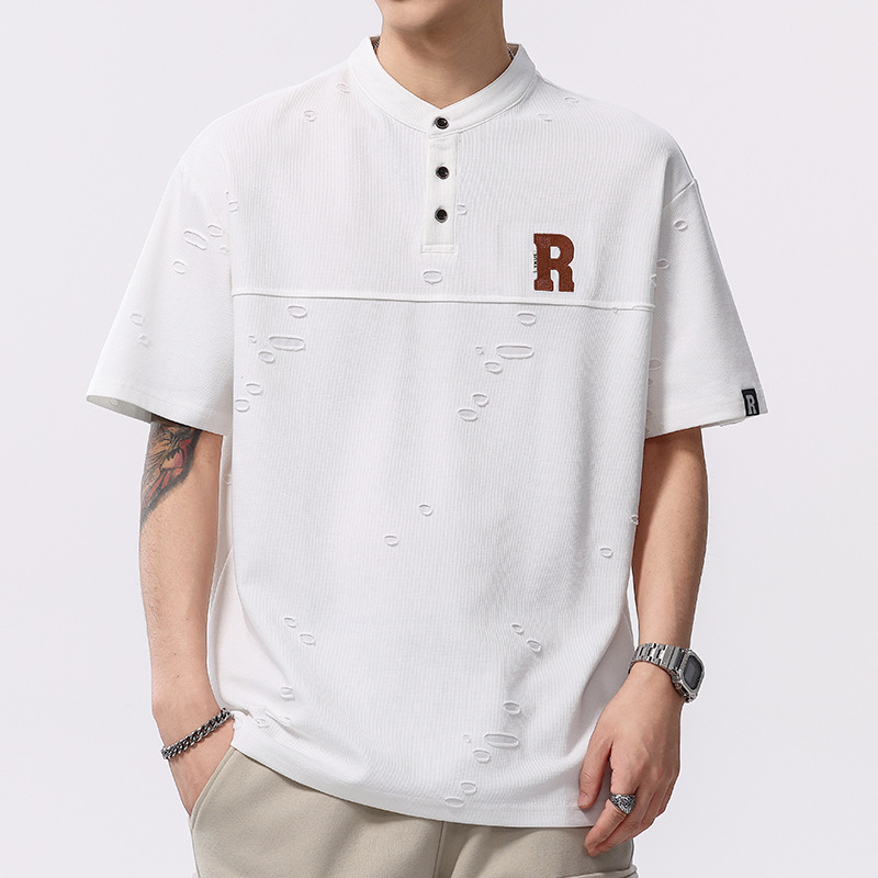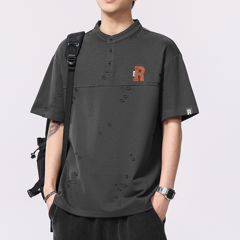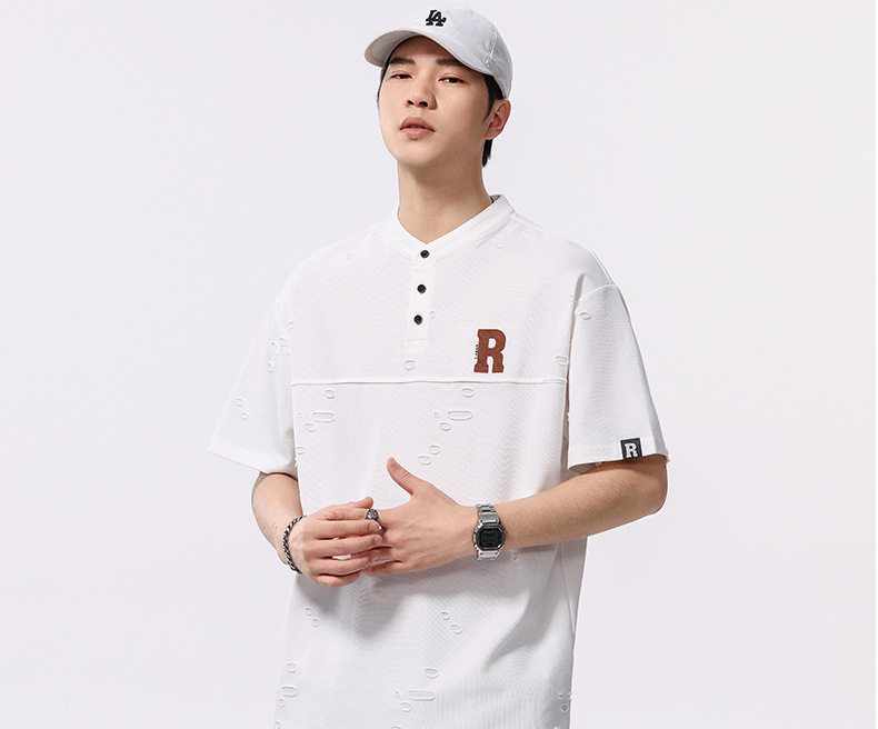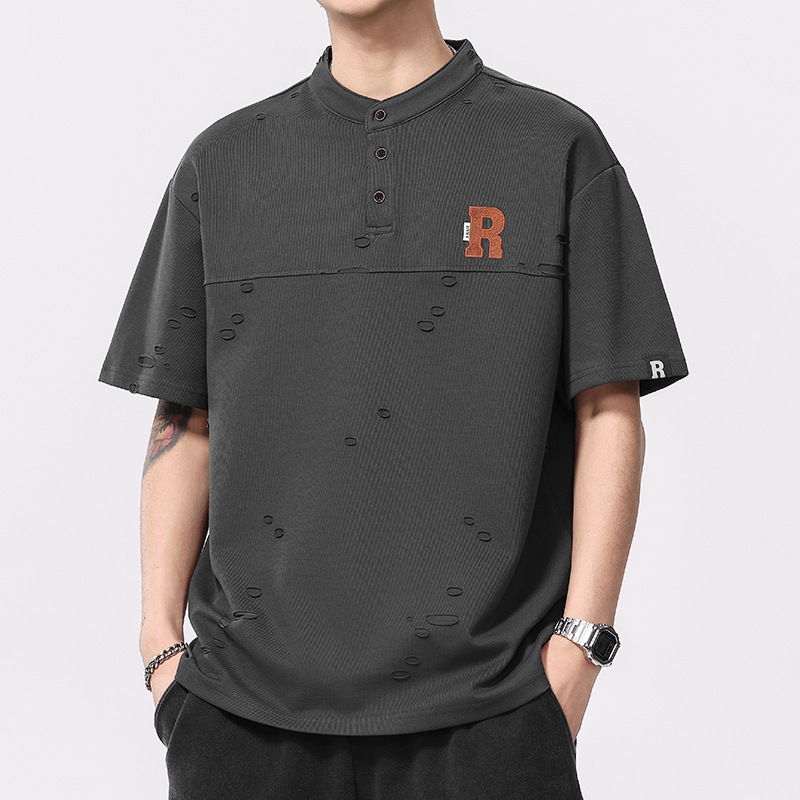美式复古刺绣短袖t恤男夏季2025新款破洞潮牌宽松亨利领polo衫男