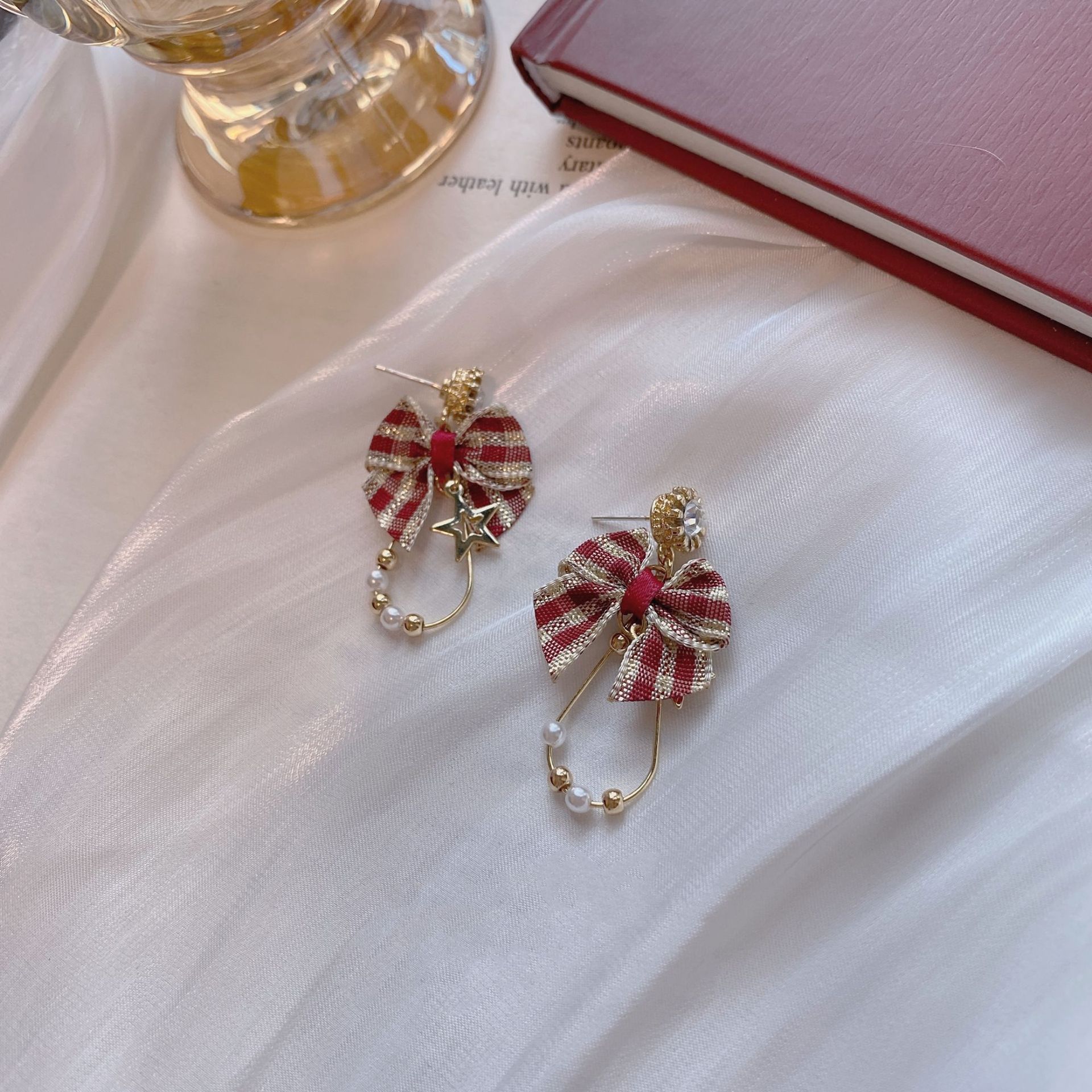 新年红圣诞耳环复古渐欲迷人无耳洞耳夹格子蝴蝶结少女日系可爱风