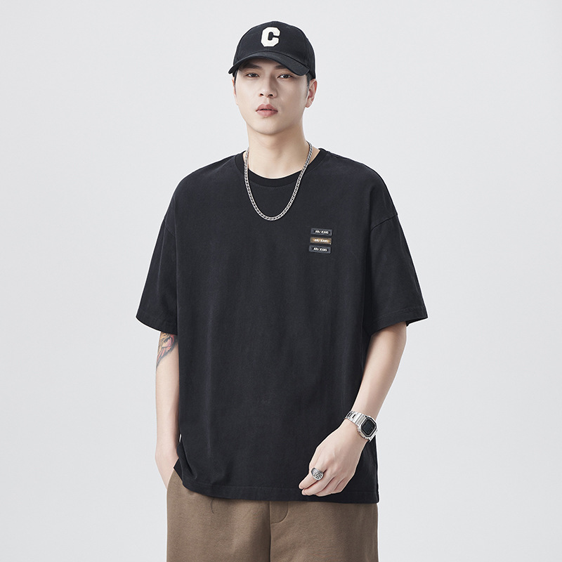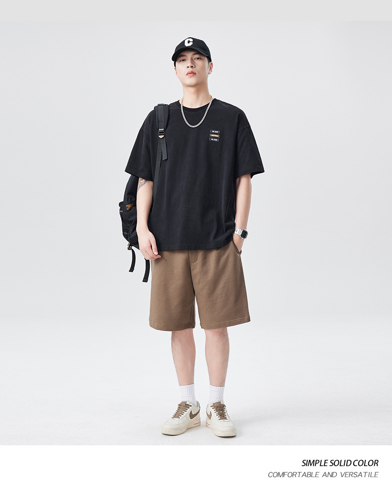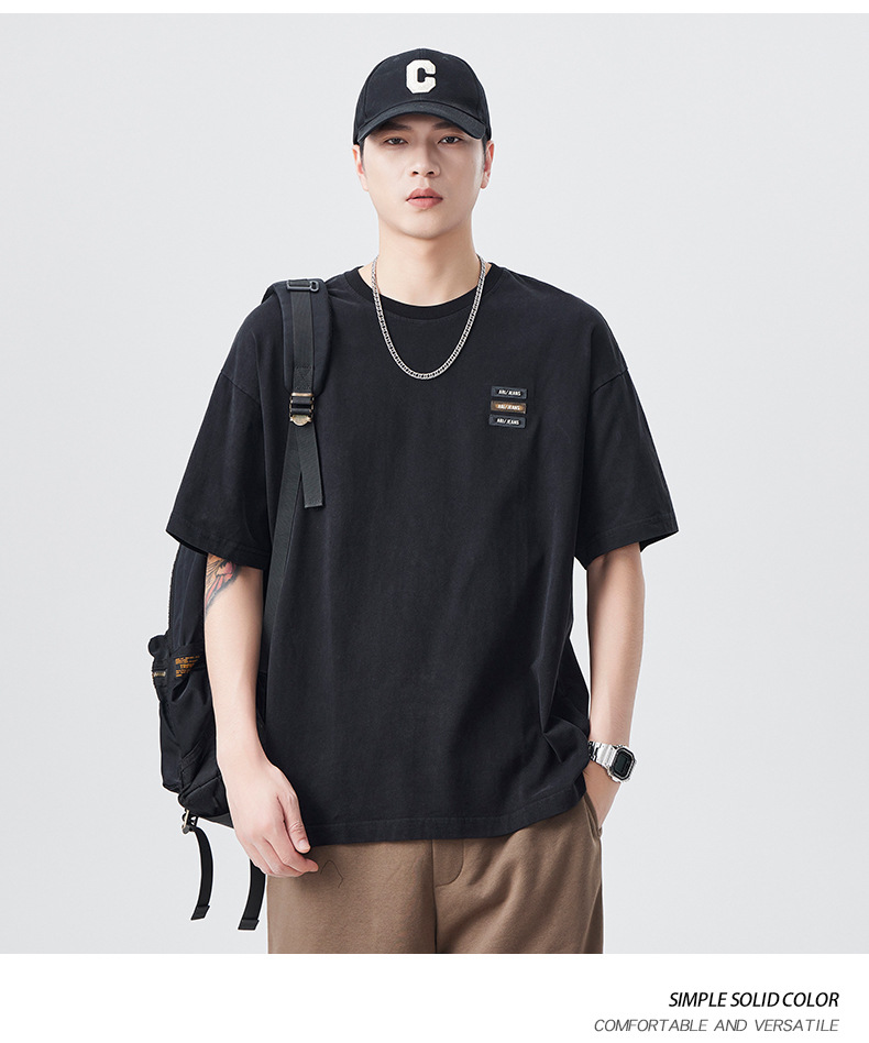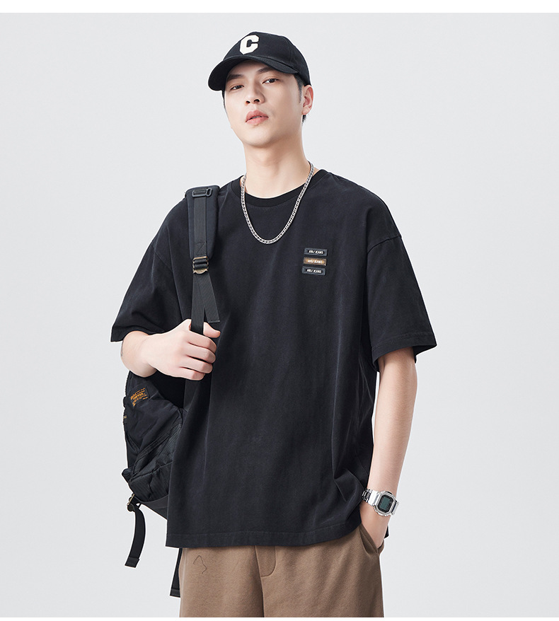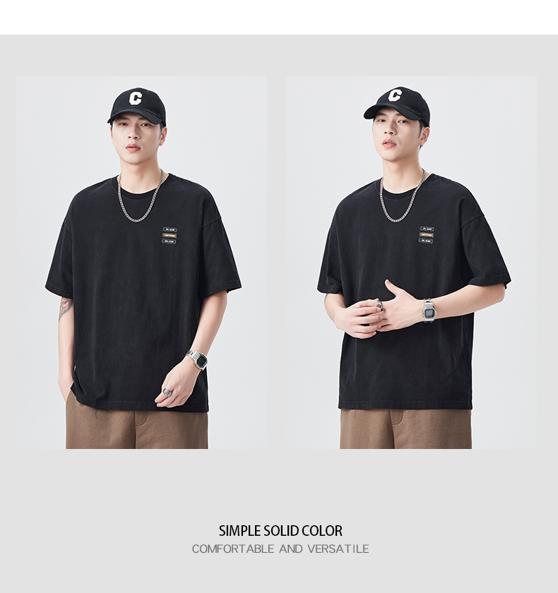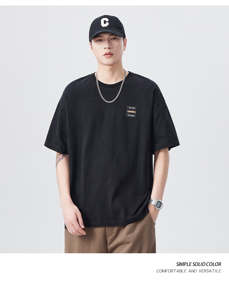 美式复古纯棉短袖t恤男士宽松圆领简约刺绣上衣夏季五分袖体恤男
