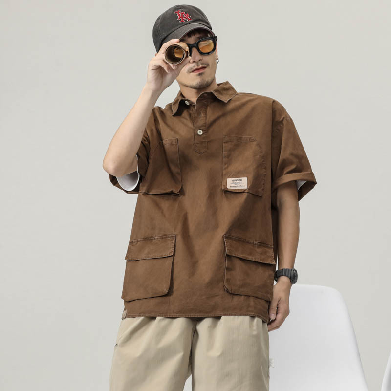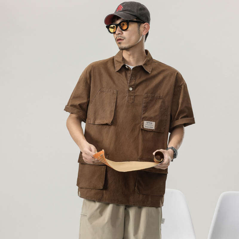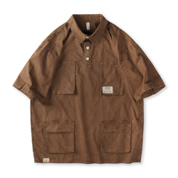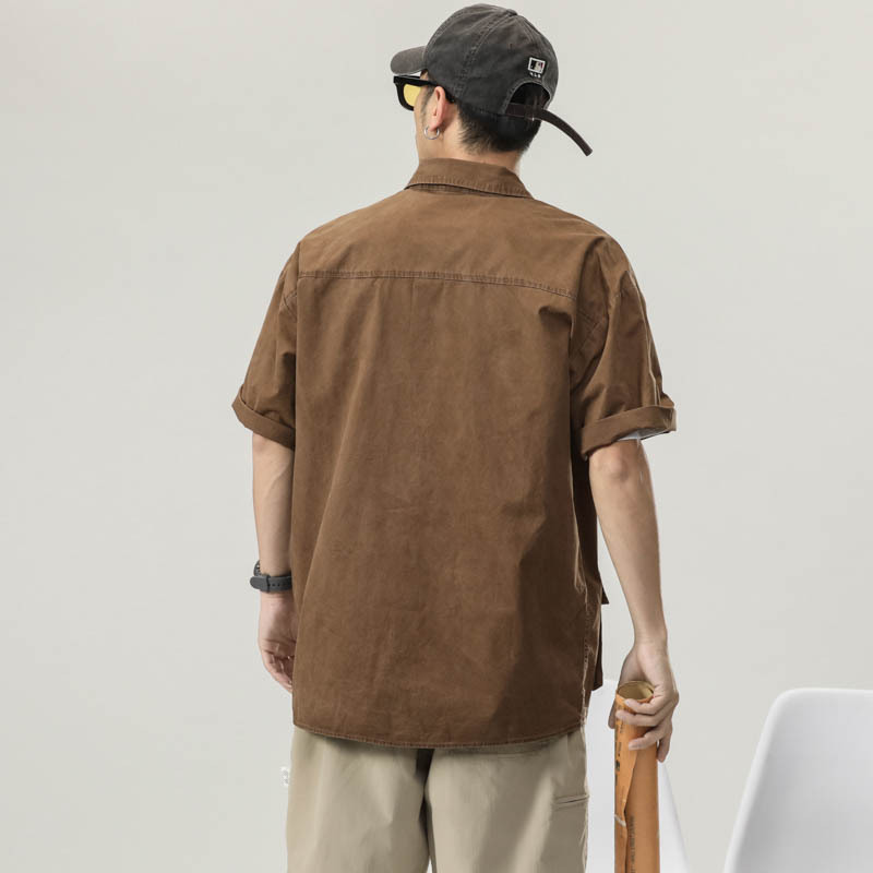 美式工装短袖衬衫男士夏季重磅复古潮流日系水洗做旧纯棉衬衣上衣