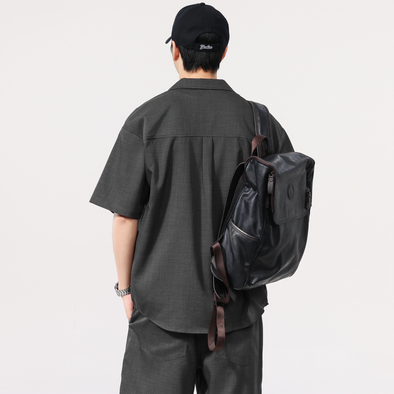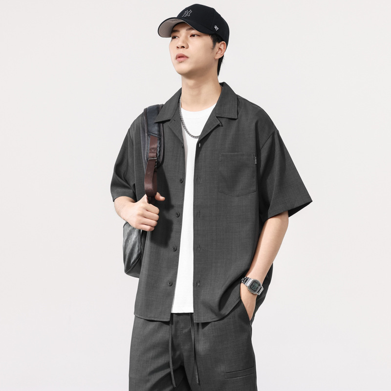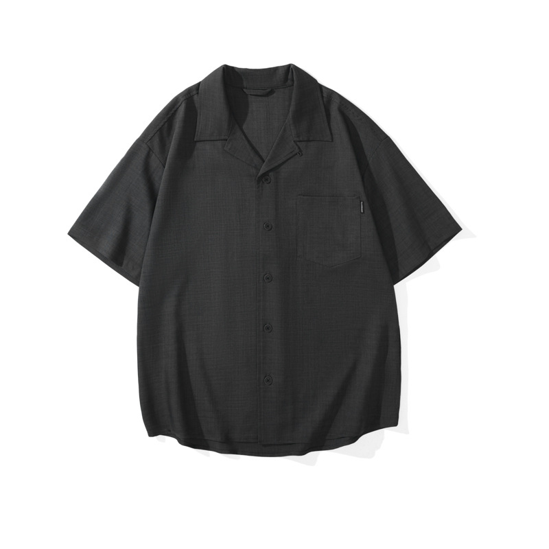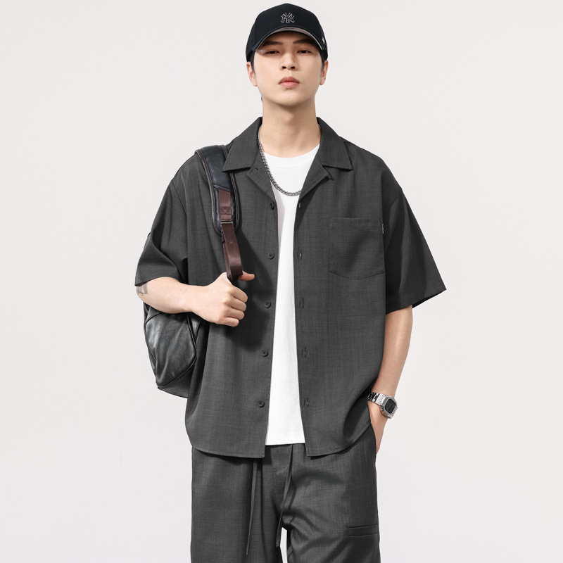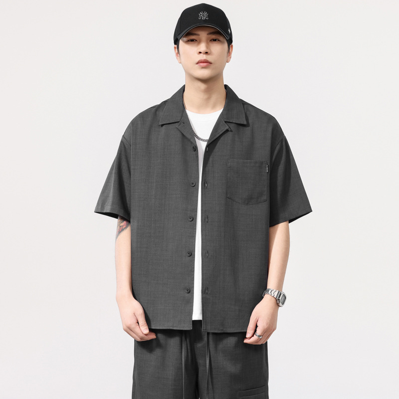 美式复古竹节纹古巴领衬衫短袖男款夏季潮牌宽松轻熟高级感衬衣男