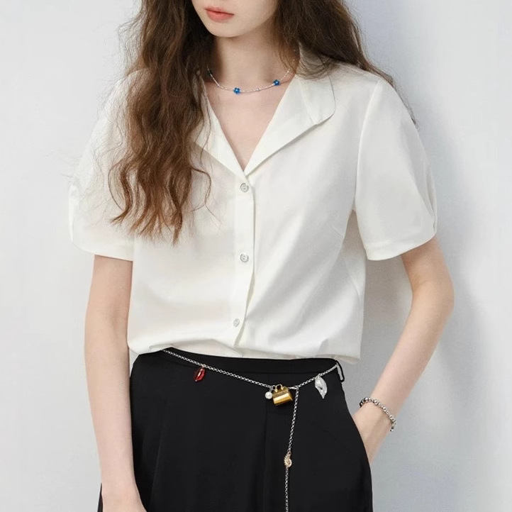 短袖衬衫女2025新款夏通勤百搭气质翻V领设计简约休闲衬衣