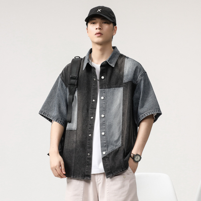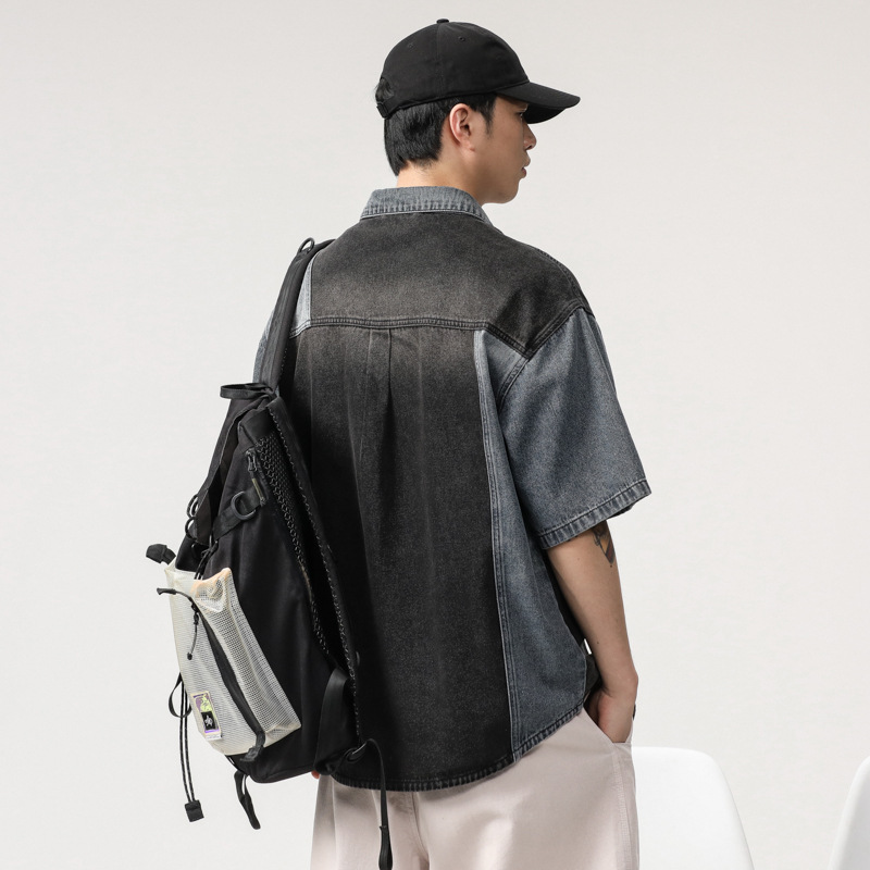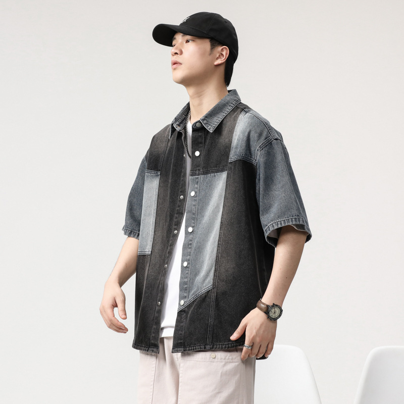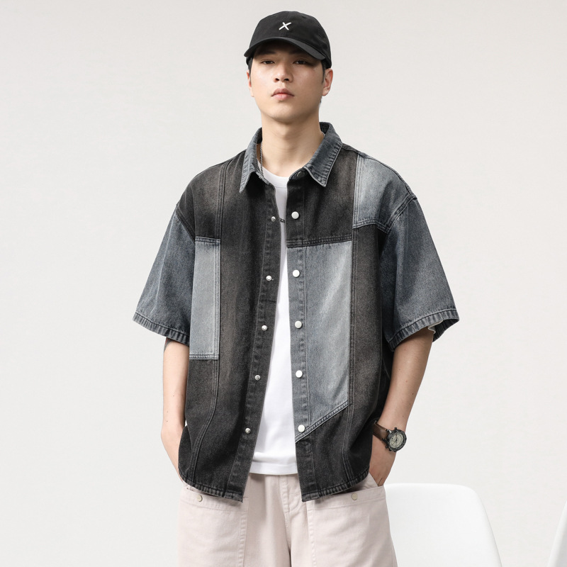 美式潮流拼色牛仔衬衫男短袖2025新款设计感ins潮牌衬衣牛仔外套
