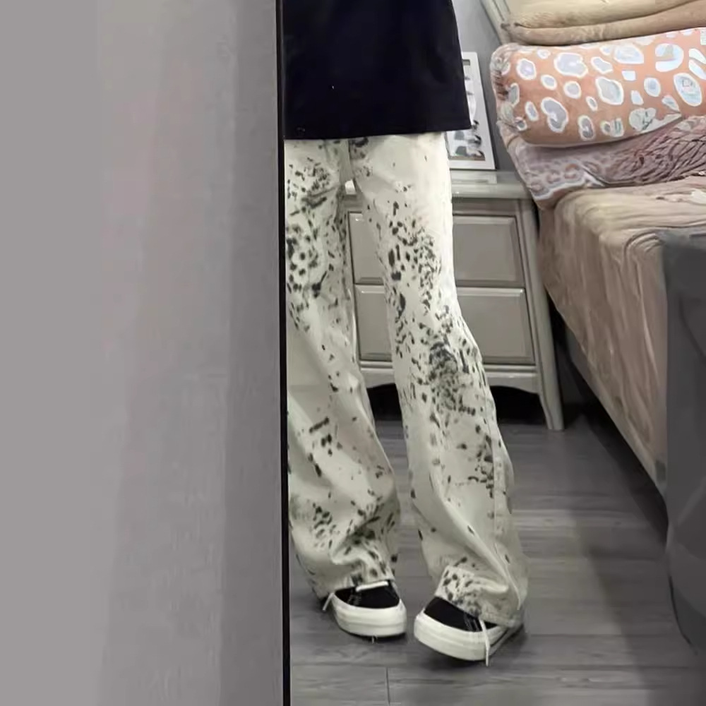 美式复古豹纹阔腿牛仔裤女夏季辣妹高街宽松休闲显瘦高腰直筒裤子
