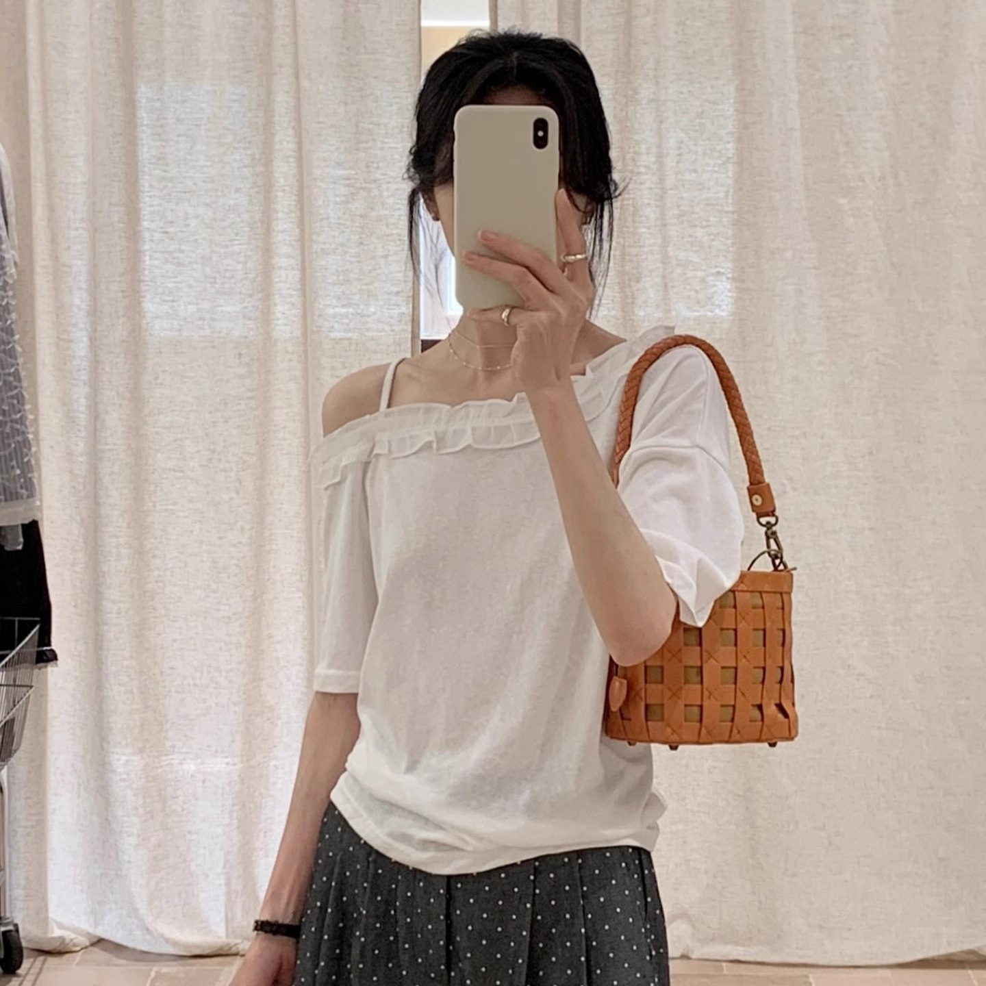 韩系斜肩花边短袖T恤女夏季薄款简约休闲设计感小众白色上衣