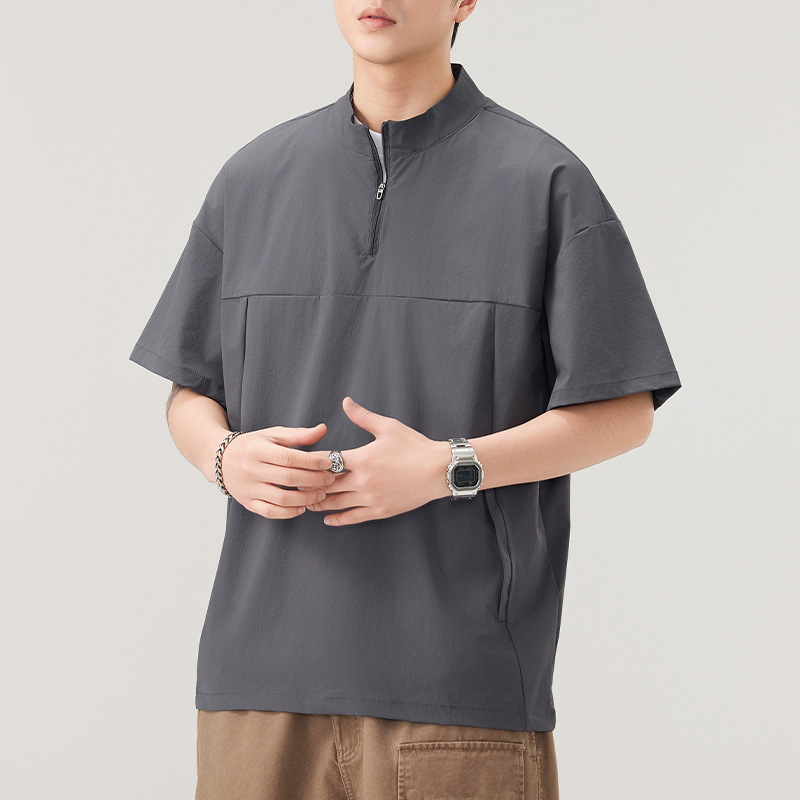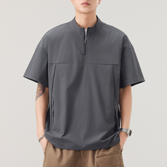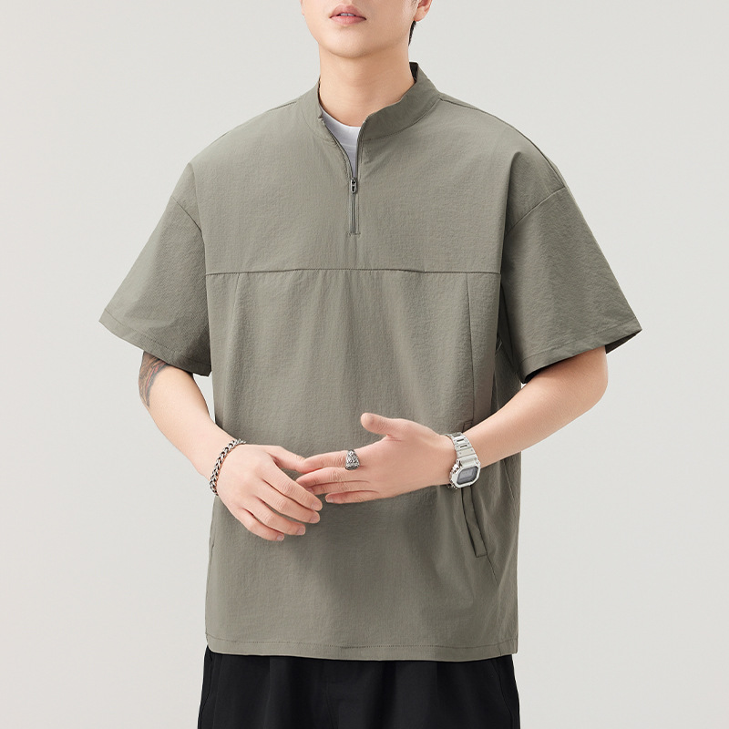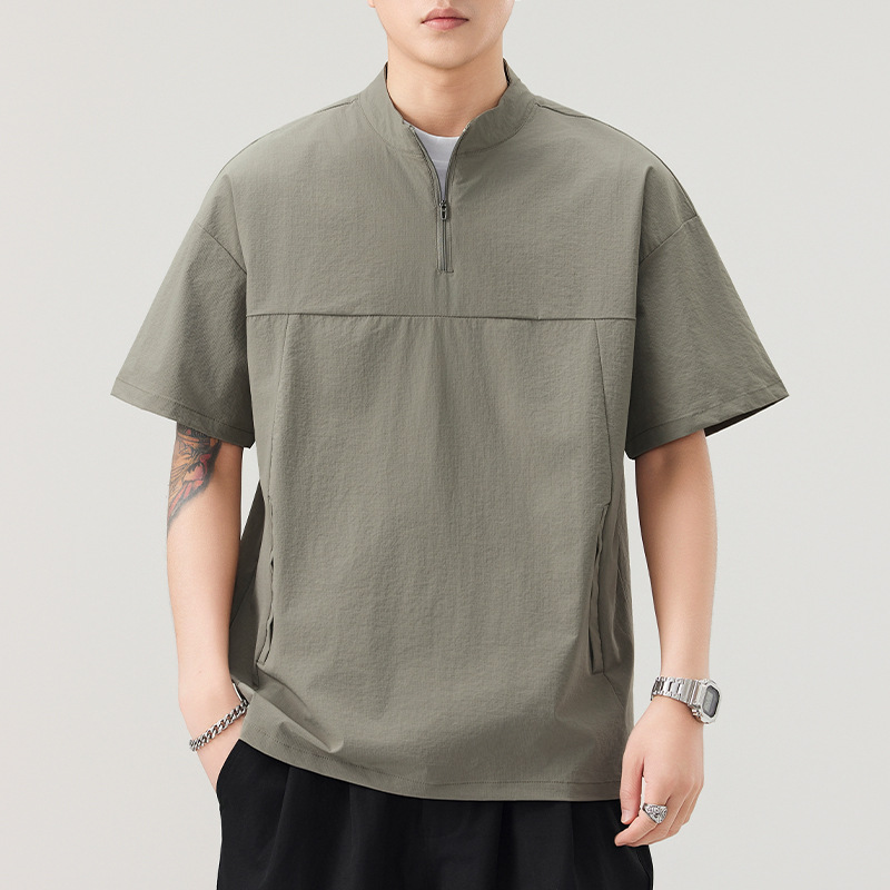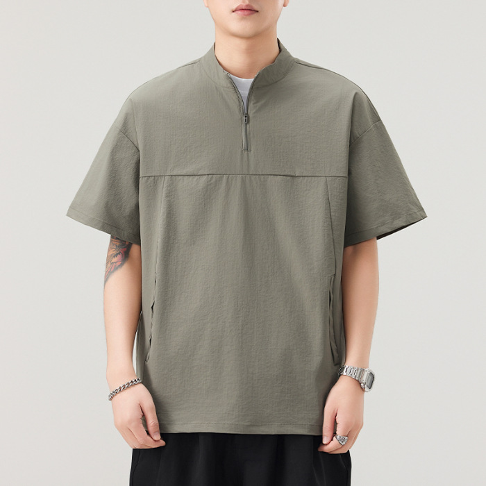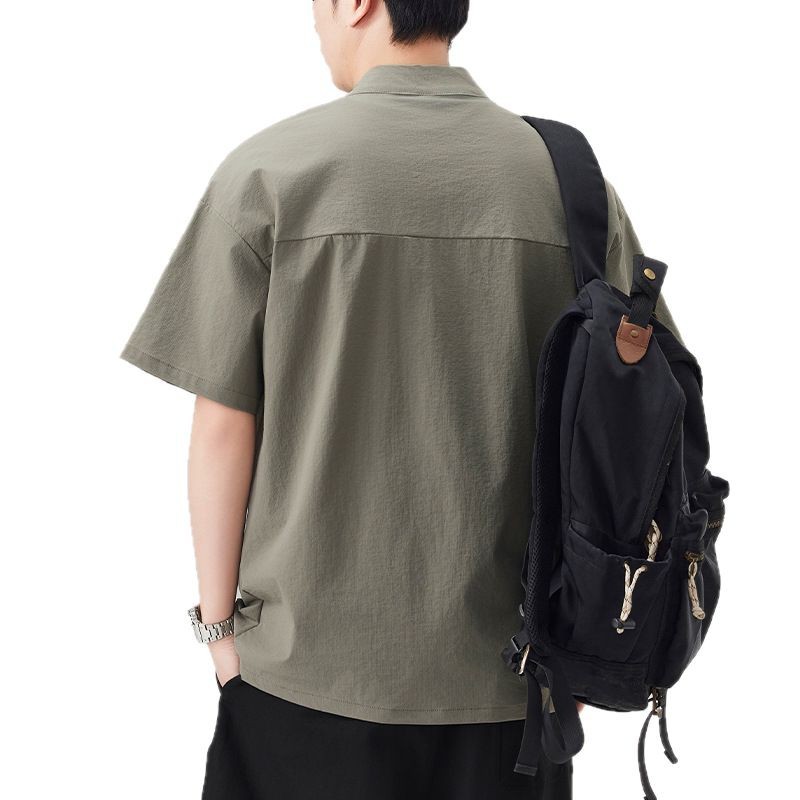 夏季新款短袖衬衫男士日系复古潮流衬衣薄款百搭五分袖半拉链套头